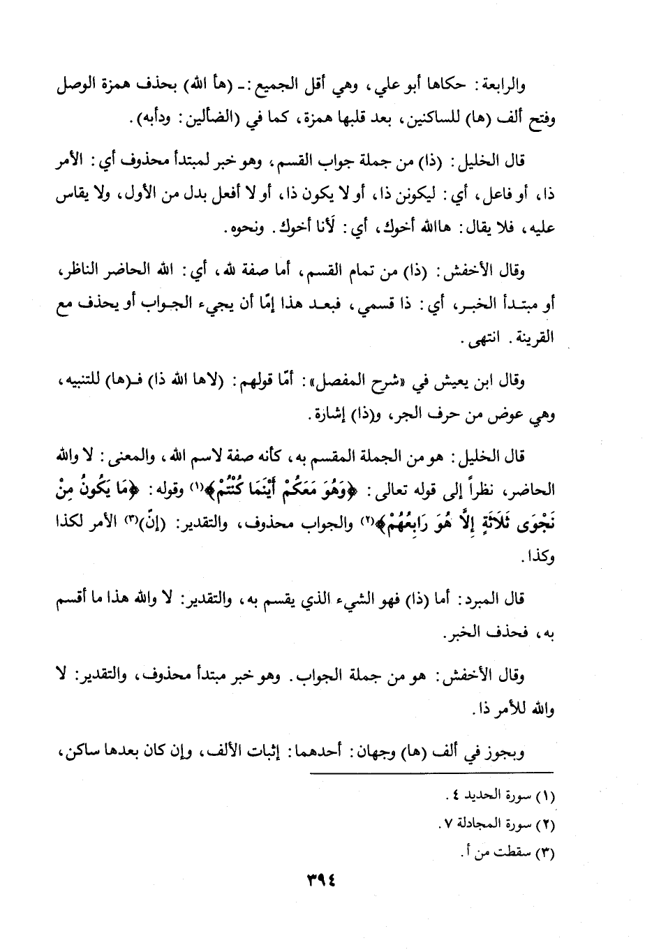 وقال ابن يعيش في "شرح المفصل": أما قولهم: (لاها الله ذا) فـ (ها) للتنبيه، وهي عوض من حرف الجر، و (ذا) إشارة. قال الخليل: وهو من جملة المقسم به، كأنه صفة لاسم الله، والمعنى: لا والله الحاضر، نظرًا إلى قوله تعالى: (وهو معكم أين ما كنتم) [الحديد: 4]، وقوله: (ما يكون من نجوى ثلاثة إلا هو رابعهم) [المجادلة: 7]، والجواب محذوف، والتقدير: إن الأمر لكذا وكذا.