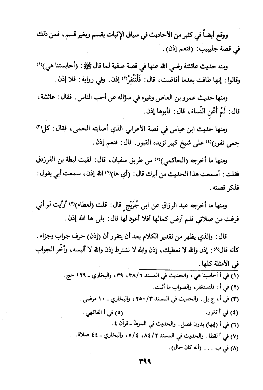 ومنه حديث عائشة رضي الله عنها في قصة صفية لما قال صلى الله عليه وسلم: (أحابستنا هي) وقالوا: إنها طافت بعدما أفاضت، قال: فلتنفر إذن. وفي رواية: فلا إذن.