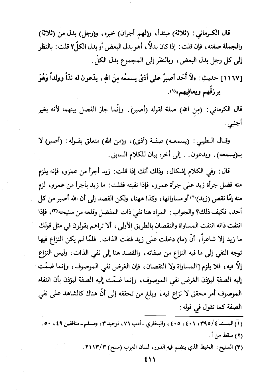 قال: وفي الكلام إشكال، وذلك أنك إذا قلت: زيد أجرأ من عمرو، فإنه يلزم منه فضل جرأة زيد على جرأة عمرو، فإذا نفيته فقلت: ما زيد بأجرأ من عمرو، لزم منه إما نقص زيد أو مساواتها، وكذا ههنا، ولكن القصد إلى أن الله أصبر من كل أحد، فكيف ذلك؟ والجواب: المراد هنا نفي ذات المفضل وقلعه من سنيحه، فإذا انتفت ذاته انتفت المساواة والنقصان بالطريق الأولى، ألا تراهم يقولون في مثل قولك ما زيد إلا شاعرًا، أنّ (ما) دخلت على زيد فنفت الذات. فلمّا لم يكن النزاع فيها توجه النفي إلى ما فيه النزاع من صفاته، والقصد هنا إلى نفي الذات، وليس النزاع إلا فيه، فلا يلزم المساواة ولا النقصان، فإن الغرض نفي الموصوف، وإنما ضمت إليه الصفة ليؤذن الغرض نفي الموصوف، وإنما ضمت إليه الصفة ليؤذن بأن انتفاء الموصوف أمر محقق لا نزاع فيه، وبلغ من تحققه إلى أن هناك كالشاهد على نفي الصفة كما تقول في قوله: