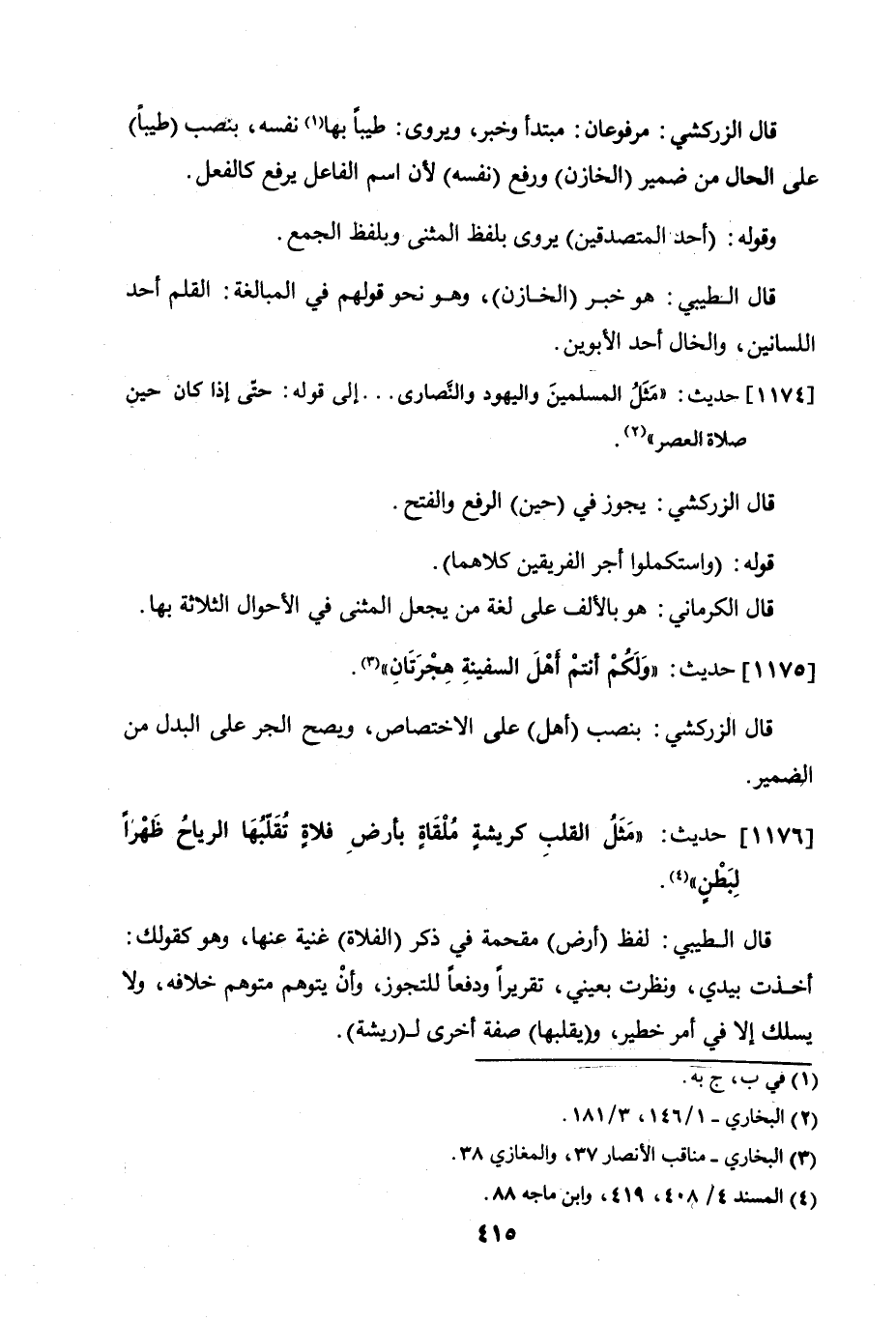 قال الزركشي: مرفوعان: مبتدأ وخبر، ويروى: طيبًا بها نفسه، بنصب (طيبًا) على الحال من ضمير (الخازن) ورفع (نفسه) لأن اسم الفاعل يرفع كالفعل.