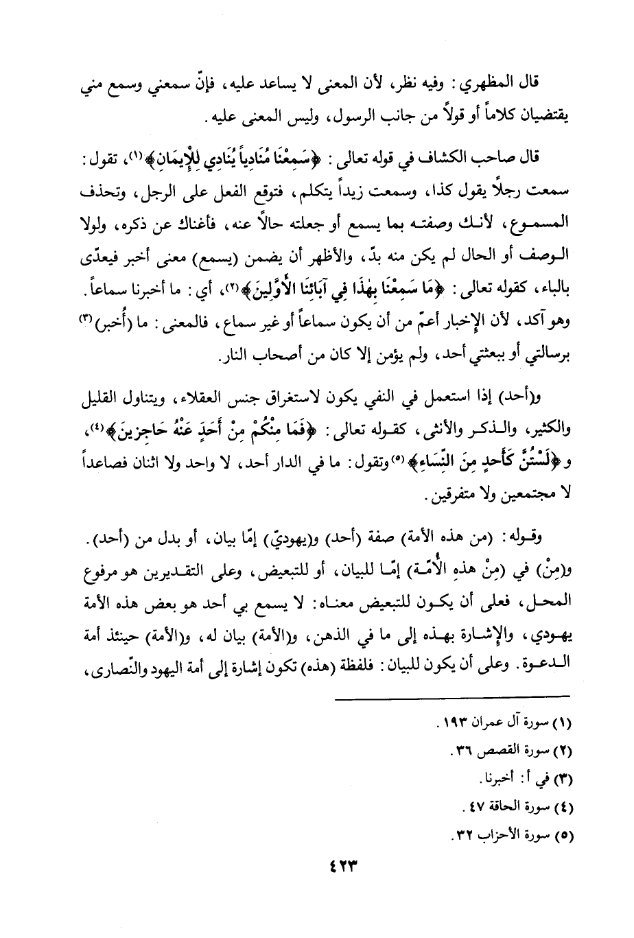 قال صاحب الكشاف في قوله تعالى: (سمعنا مناديًا ينادي للإيمان) [آل عمران: 193]، تقول: سمعت رجلاً يقول كذا، وسمعت زيداً يتكلم. فتوقع الفعل على الرجل، وتحذف المسموع، لأنك وصفته بما يسمع، أو جعلته حالاً عنه، فأغناك عن ذكره، ولولا الوصف أو الحال لم يكن منه بدّ، والأظهر أن يضمن (يسمع) معنى أخبر، فيعدى بالباء، كقوله تعالى: (ما سمعنا بهذا في آبائنا الأولين) [القصص: 36]، أي: ما أخبرنا سماعًا، وهو آكد. لأن الإخبار أعم من أن يكون سماعًا أو غير سماع، فالمعنى: ما أخبر برسالتي أو ببعثتي أحد ولم يؤمن، إلا كان من أصحاب النار.