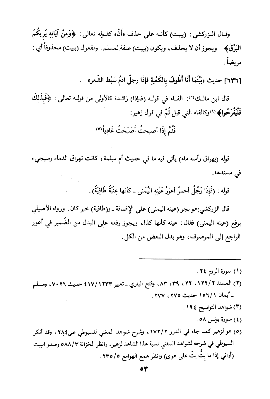 قال الزركشي: هو بجر (عينه اليمنى) على الإضافة – و (طافية) خبر كان. ورواه الأصيلي برفع (عينه اليمنى) فقال: عينه كأنها كذا، ويجوز رفعه على البدل من الضمير في أعور الراجع إلى الموصوف، وهو بدل البعض من الكل.