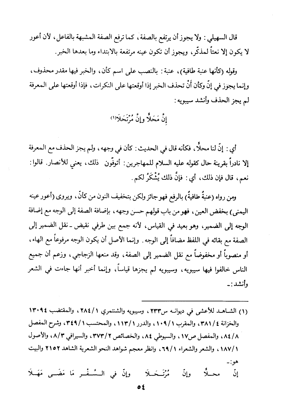 ومن رواه (عنبةٌ طافيةٌ) بالرفع فهو جائز ولكن بتخفيف النون من كأن، ويروى (أعور عينه اليمنى) بخفض العين، فهو من باب قولهم حسن وجهه، بإضافة الصفة إلى الوجه مع إضافة الوجه إلى الضمير، وهو بعيد في القياس، لأنه جمع بين طرفي نقيض –نقل الضمير إلى الصفة مع بقائه في اللفظ مضافًا إلى الوجه. وإنما الأصل أن يكون الوجه مرفوعًا مع الهاء، أو منصوبًا أو مخفوضًا مع نقل الضمير إلى الصفة، وقد منعها الزجاجي، وزعم أن جميع الناس خالفوا فيها سيبويه، وسيبويه لم يجزها قياسًا، وإنما أخبر أنها جاءت في الشعر وأنشد:
