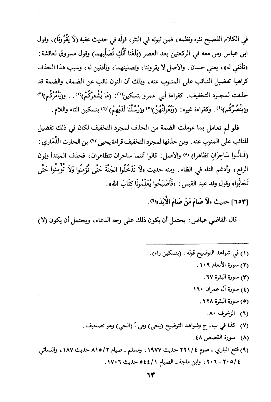 فلو لم تعامل بما عوملت الضمة من الحذف لمجرد التخفيف لكان في ذلك تفضيل للنائب على المنوب عنه. ومن حذفها لمجرد التخفيف قراءة يحيى بن الحارث الذِّماري: (قالوا ساحران تظاهرا) [القصص: 48] والأصل: قالوا أنتما ساحران تتظاهران، فحذف المبتدأ ونون الرفع، وأدغم التاء في الظاء. ومنه حديث "لا تدخلوا الجنّة حتى تؤمنوا ولا تؤمنوا حتّى تحابّوا" وقول وفد عبد القيس: "فأصبحوا يعلِّمونا كتاب الله".