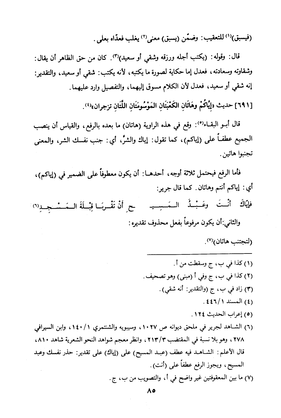 قال أبو البقاء: وقع في هذه الرواية (هاتان) ما بعده بالرفع، والقياس أن ينصب الجميع عطفًا على (إياكم)، كما تقول: إياك والشَّرَّ، أي: جنب نفسك الشر، والمعنى تجنبوا هاتين.