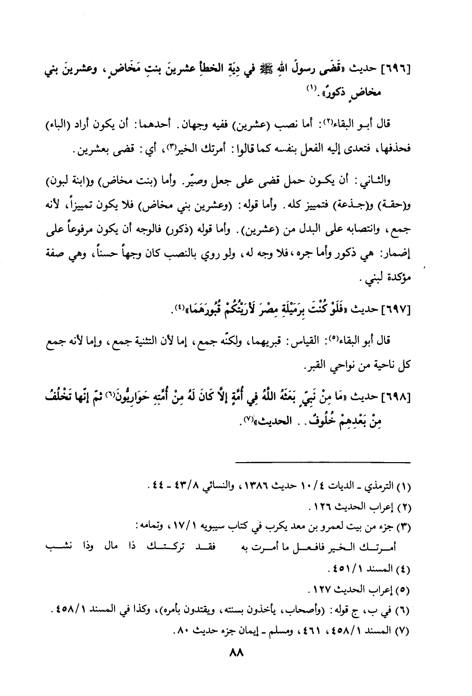 والثاني: أن يكون حمل قضى على جعل وصيّر. وأما (بنت مخاض) و (ابنة لبون) و (حقة) و (جذعة) فتمييز كله. وأما قوله: (وعشرين بني مخاص) فلا يكون تمييزًا، لأنه جمع، وانتصابه على البدل من (عشرين). وأما قوله (ذكور) فالوجه أن يكون مرفوعًا على إضمار: هي ذكور وأما جره، فلا وجه له، ولو روي بالنصب كان وجهًا حسنًا، وهي صفة مؤكدة لبني.