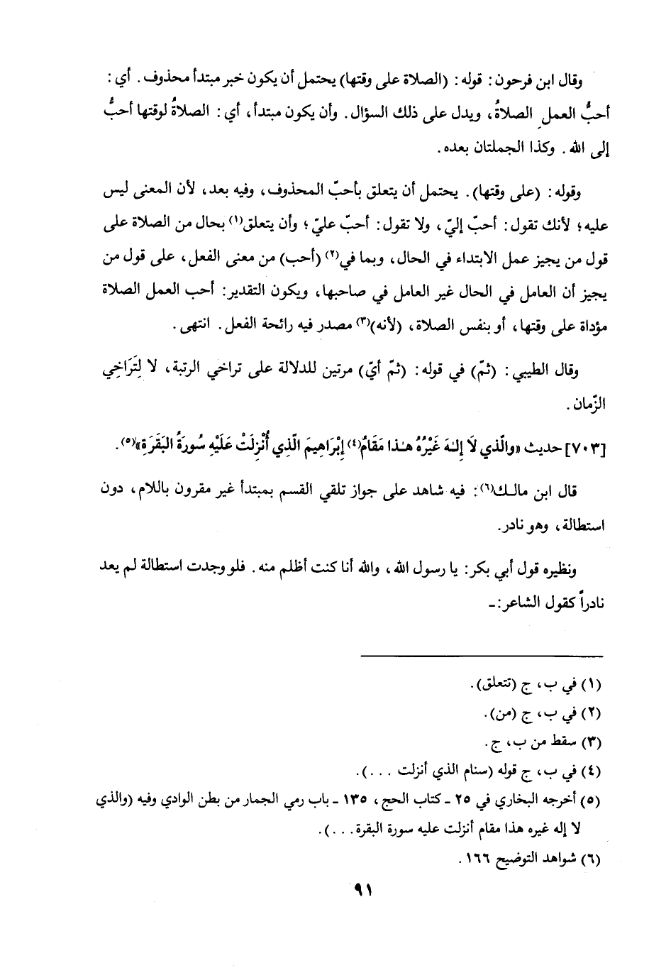 وقال ابن فرحون: قوله: (الصلاة على وقتها) يحتمل أن يكون خبر مبتدأ محذوف. أي: أحبُّ العملِ الصلاةُ، ويدل على ذلك السؤال. وأن يكون مبتدأ، أي: الصلاةُ لوقتها أحبُّ إلى الله. وكذا الجملتان بعده.