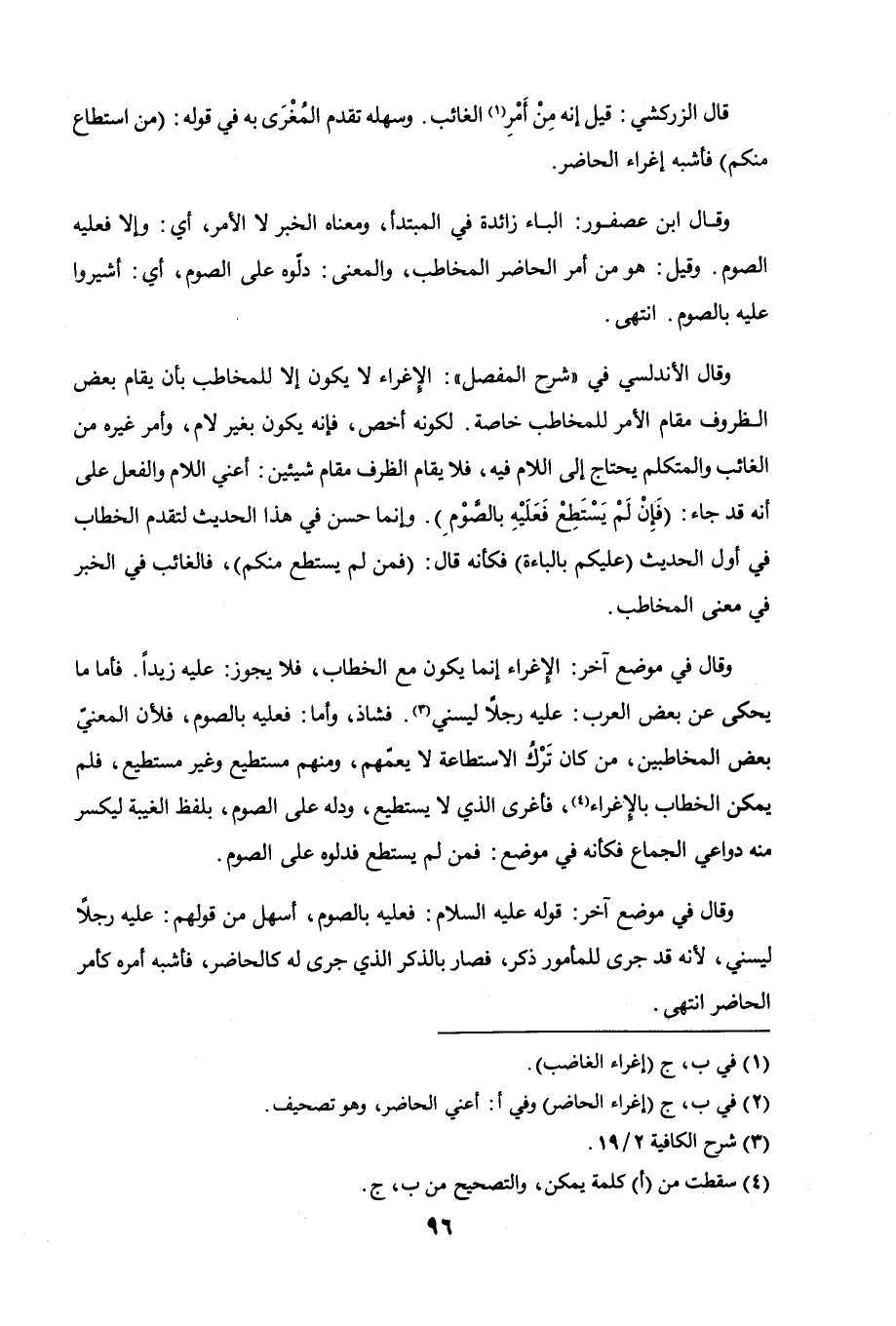وقال في موضع آخر: الإغراء إنما يكون مع الخطاب، فلا يجوز: عليه زيدًا. فأما ما يحكى عن بعض العرب: عليه رجلاً ليسني. فشاذ، وأما: فعليه بالصوم، فلأن المعنيّ بعض المخاطبين، من كان ترك الاستطاعة لا يعمّهم، ومنهم مستطيع وغير مستطيع، فلم يمكن الخطاب بالإغراء، فأغرى الذي لا يستطيع، ودله على الصوم، بلفظ الغيبة ليكسر منه دواعي الجماع فكأنه في موضع: فمن لم يستطع فدلوه على الصوم.