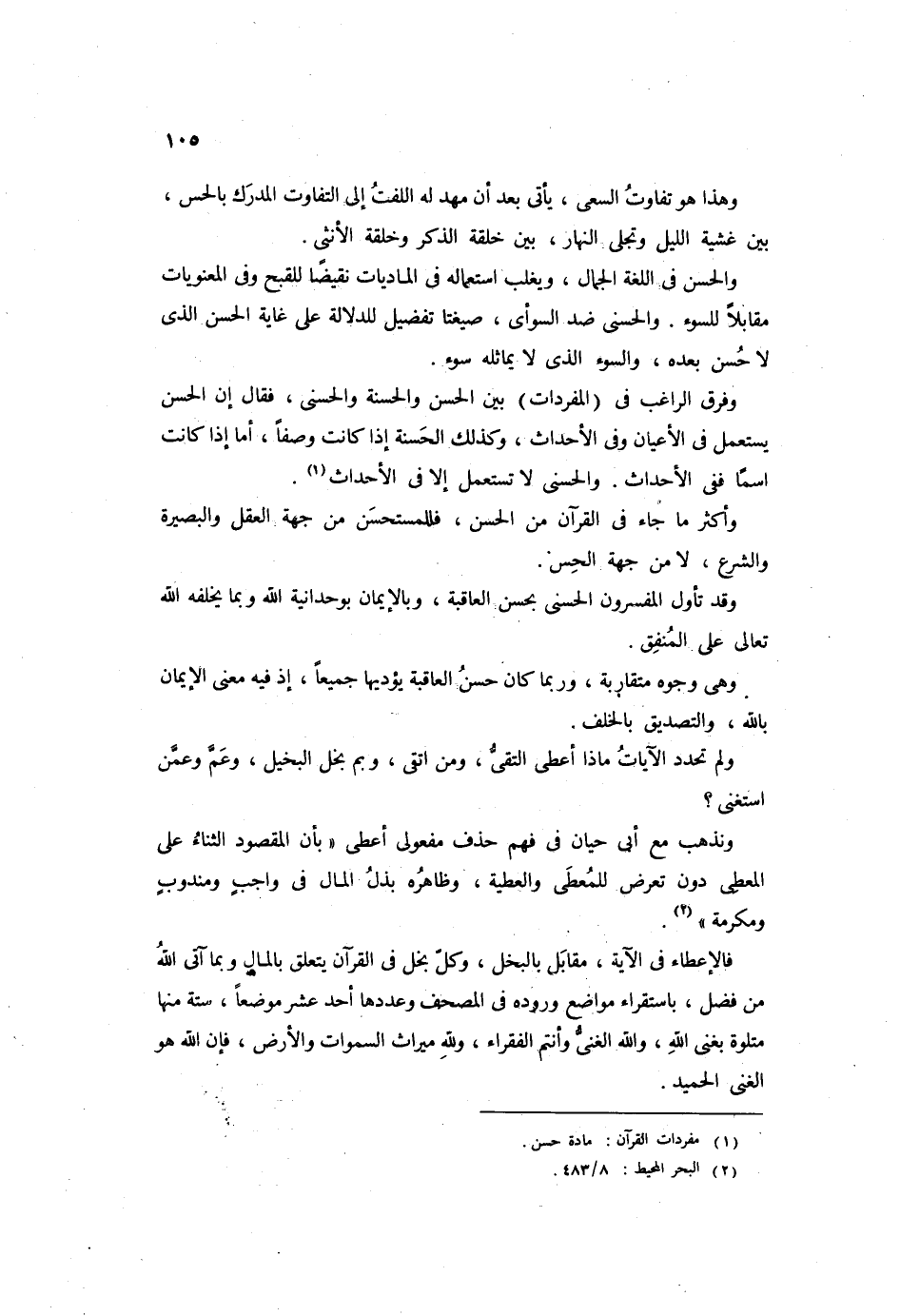 والحسن في اللغة الجمال، ويغلب استعماله في الماديات نقيضاً وفي المعنويات مقابلاً للسوء. والحنى ضد اليوأى، صيغتا تفضيل للدلالة على غاية الحسن الذي لا حسن بعده، والسوء الذي لا يماثله سوء.