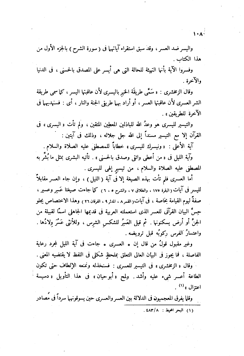 أما العسرى فلم تأت بهذه الصيغة إلا في آية (الليل) ، وإن جاء العسر مقابلاً لليسر في آيات (البقرة 175، والطلاق 7، والشرح 5، 6) كما جاءت صيغتا وعسر وعسير، صفة ليوم القيامة بخاصة، في آيات (القمر 8، المدثر 9، الفرقان 26) وهذا الاختصاص يجلو حس البيان القرآني للعسر الذي استعملته العربية في قديمها الجاهلي اسماً لقبيلة من الجن أو أرض يسكنونها. ثم قيل العسر للشكس الشرس، وللأنثى عسر ولادها.
