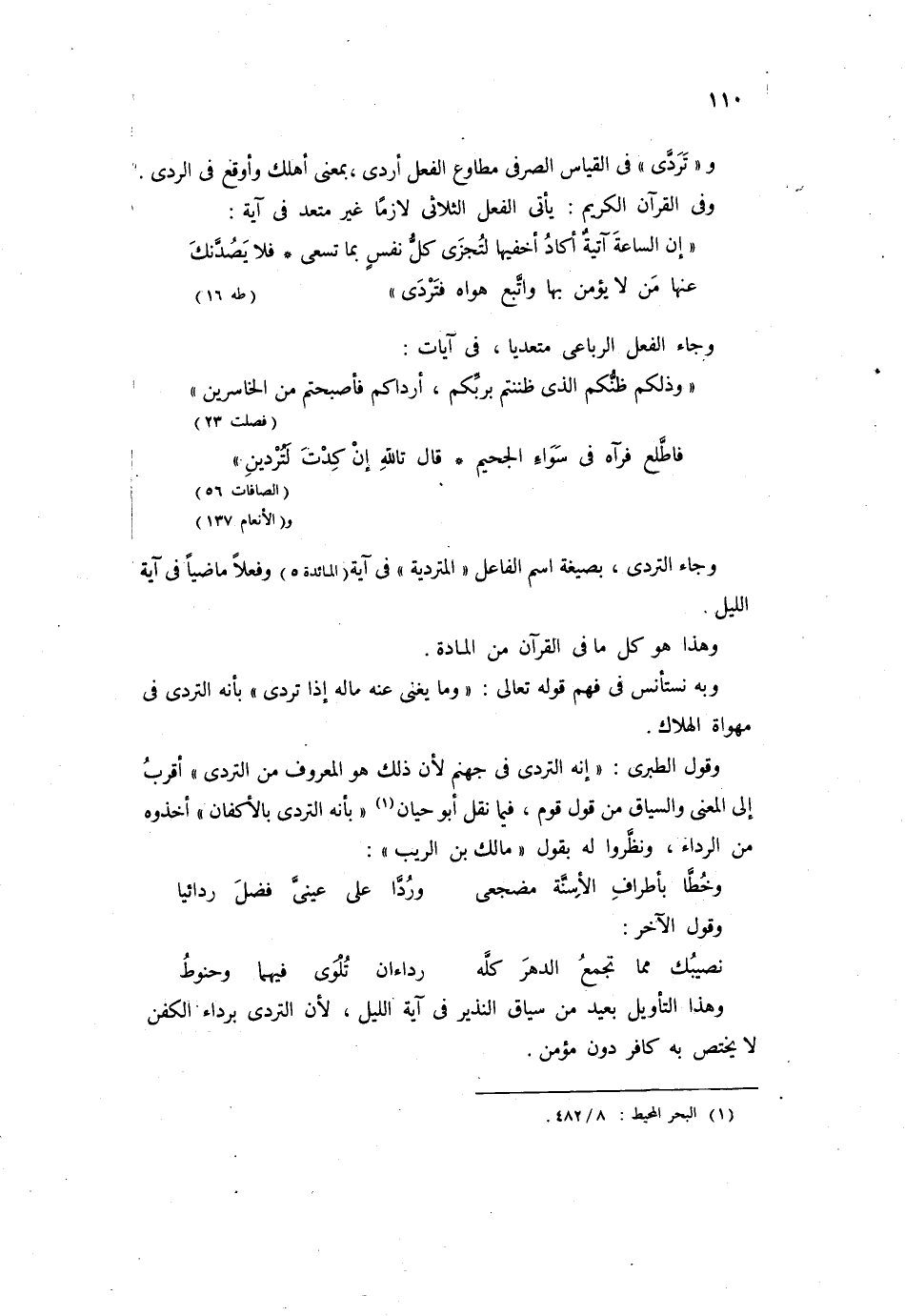 وبه نستأنس في فهم قوله تعالى: {وَمَا يُغْنِي عَنْهُ مَالُهُ إِذَا تَرَدَّى} بأنه التردى في مهواة الهلاك.