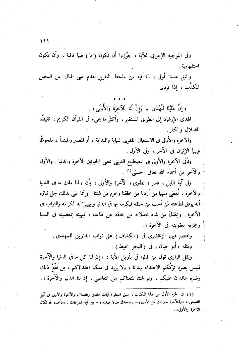 وفي آية الليل، فسر "الطبري" الآخرة والأولى، بأن "لنا ملك ما في الدنيا والآخرة، نعطى منهما من أردنا من خلقنا ونحرم من شئنا. وإنما عنى بذلك جل ثناؤه أنه يوفق لطاعته من أحب من خلقه فيكرمه بها في الدنيا ويهيئ له الكرامة والثواب في الآخرة. ويخذل من شاء خذلانه من خلقه عن طاعته، فيهينه بمعصيته في الدنيا ويخزيه بعقوبته في الآخرة".
