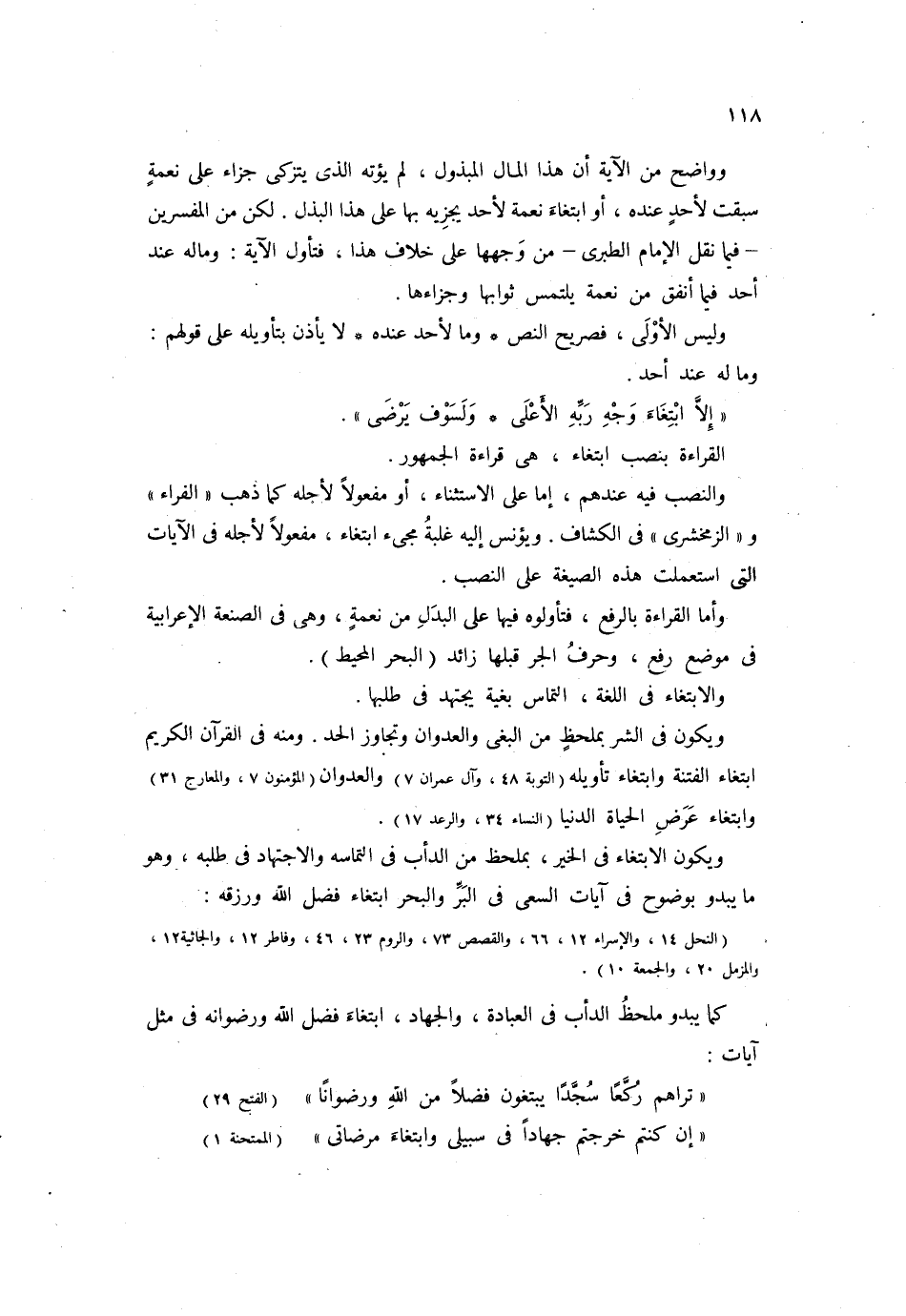 والنصب فيه عندهم، إما على الاستثناء، أو مفعولاً لأجله كما ذهب "الفراء" و"الزمخشري" في الكشاف. ويؤنس إليه غلبة مجئ ابتغاء، مفعولاً لأجله في الآيات التي استعملت هذه الصيغة على النصب.