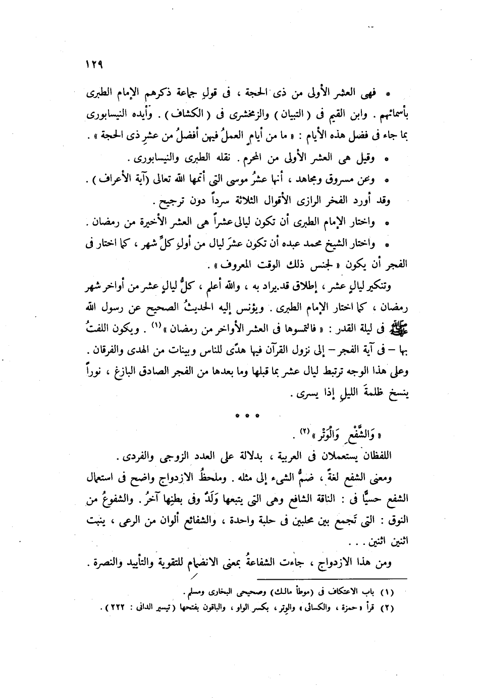 وتنكير ليال عشر، إطلاق قد يراد به، والله أعلم، كل ليال عشر من أواخر شهر رمضان، كما اختار الإمام الطبري. ويؤنس إليه الحديث الصحيح عن رسول الله - صلى الله عليه وسلم - في ليلة القدر: "فالتمسوها في العشر الأواخر من رمضان". ويكون اللفت بها - في آية الفجر - إلى نزول القرآن فيها هدى للناس وبينات من الهدى والفرقان.