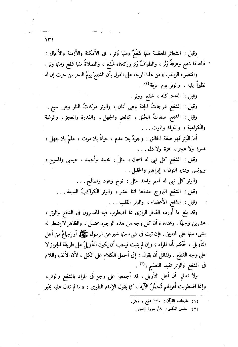 وقد بلغ ما أورده الفخر الرازي مما اضطرب فيه المفسرون في الشفع والتر، عشرين وجهاً. وعنده "أن كل وجه من هذه الوجوه محتمل، والظاهر لا إشعار له بشيء منها على التعيين. فإن ثبت في شيء منها خبر عن الرسول - صلى الله عليه وسلم - أو إجماع من أهل التأويل، حكم بأنه المراد، وإن لم يثبت فيجب أن يكون التأويل على طريقة الجواز لا على وجه القطع. ولقائل أن يقول: إني أحمل الكلام على الكل، لأن الألف واللام في الشفع والوتر تفيد التعميم".