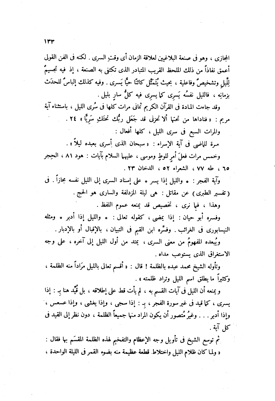 المجازى، وهو في صنعة البلاغيين لعلاقة الزمان أي وقت السرى. لكنه في الفن القولي أعمق نفاذاً من ذلك الملحظ القريب المتبادر الذي تكتفي به الصنعة، إذ فيه تجسيم لليل وتشخيص وفاعلية، بحيث يتمثل كائناً حياً يسرى. وفيه كذلك إلباس للحدث بزمانه، فالليل نفسه يسرى كما يسرى فيه كل كل سار بليل.