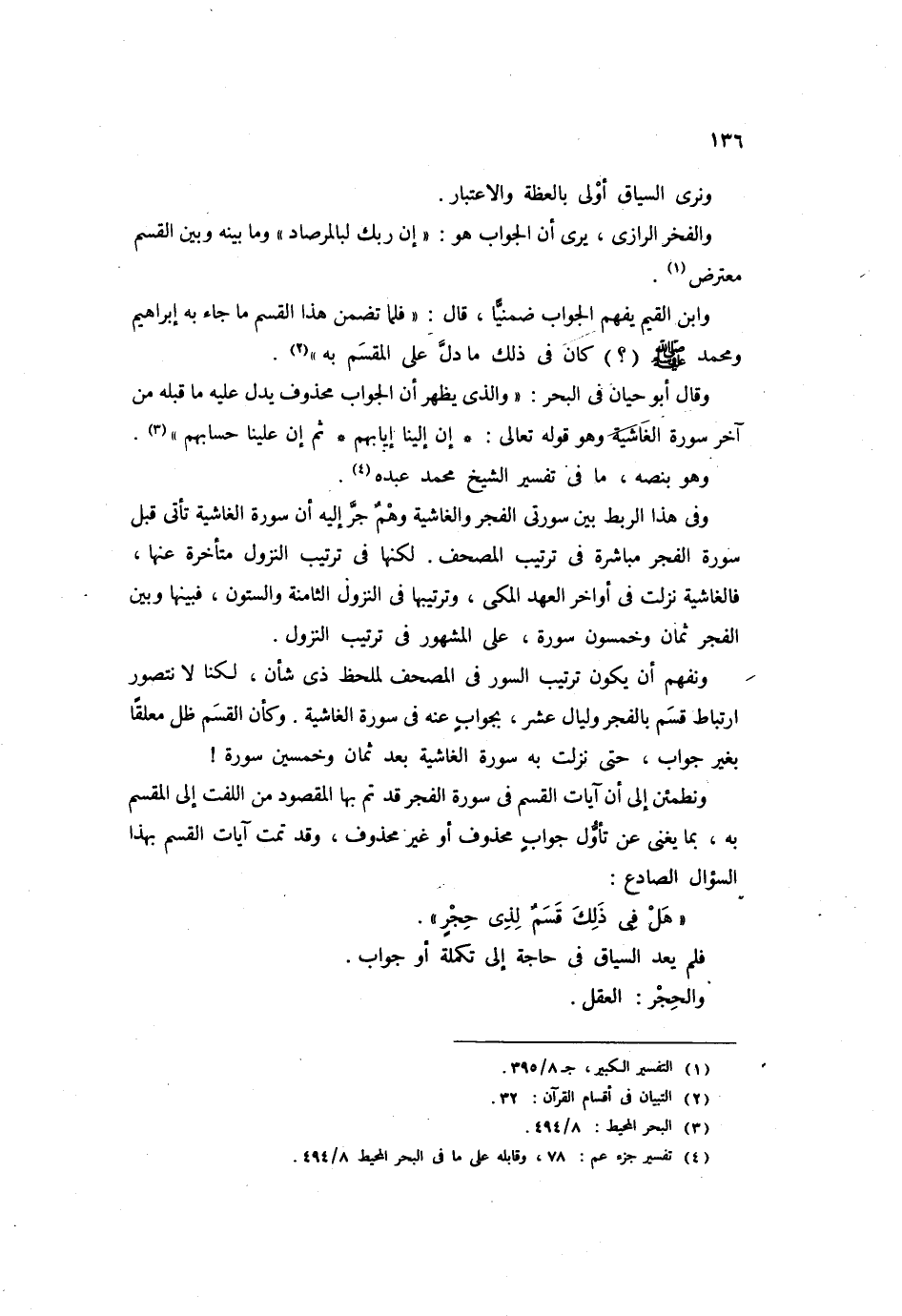 ونفهم أن يكون ترتيب السور في المصحف لملحظ ذي شأن، لكنا لا نتصور ارتباط قسم بالفجر وليال عشر، بجواب عنه في سورة الغاشية، وكأن القسم ظل معلقاً بغير جواب، حتى نزلت به سورة الغاشية بعد ثمان وخمسين سورة!