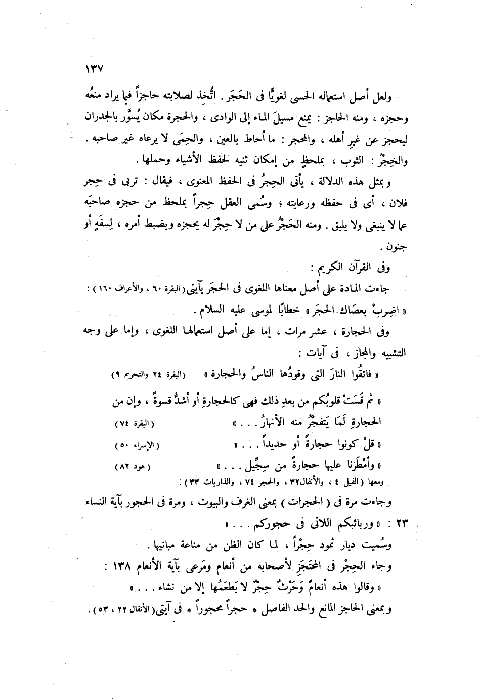 وبمعنى الحاجز المانع والحد الفاصل {حِجْرًا مَحْجُورًا} في آيتى (الأنفال 22، 53)