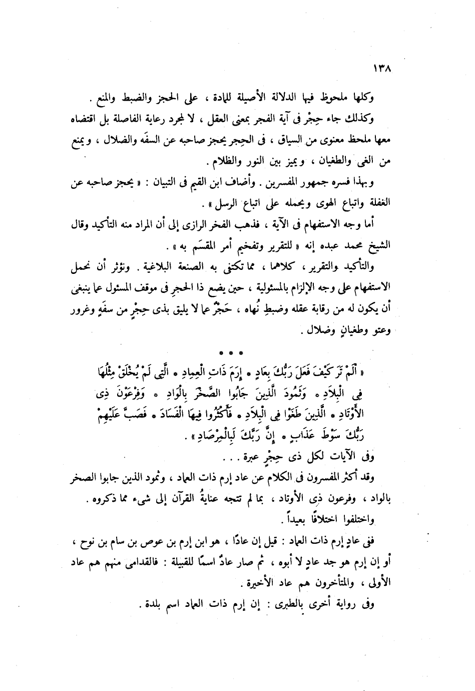 وقد أكثر المفسرون في الكلام عن عاد إرم ذات العماد، وثمود الذين جابوا الصخر بالواد، وفرعون ذي الأوتاد، بما لم تتجه عناية القرآن إلى شيء مما ذكروه.
