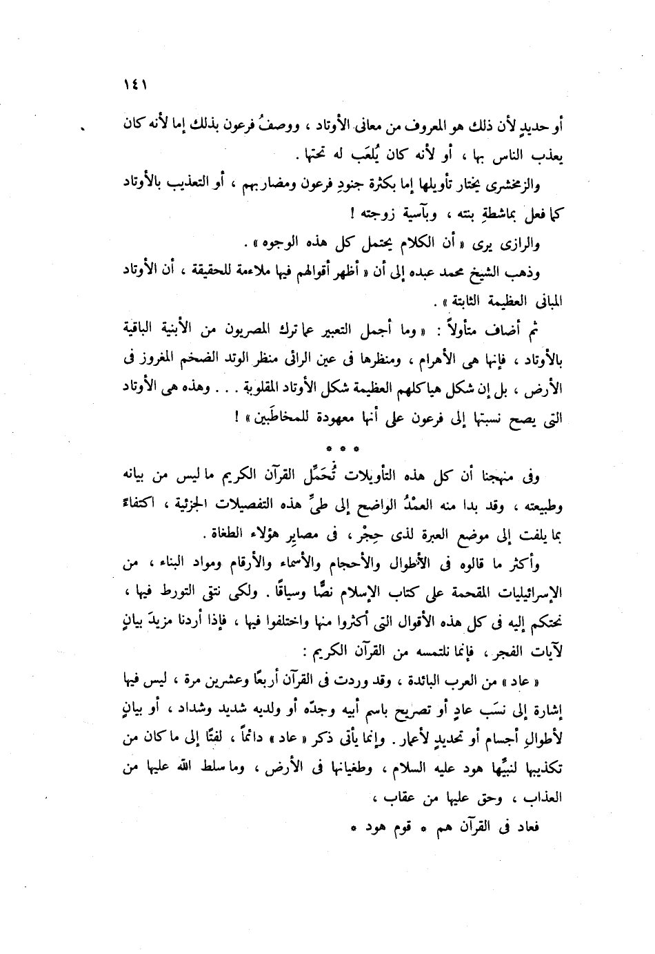ثم أضاف متاولاً: "وما أجمل التعبير عما ترك المصريون من الأبنية الباقية بالأوتاد، فإنها هي الأهرام، ومنظرها في عين الرائي منظر الوتد الضخم المغروز في الأرض، بل أن شكل هياكلهم العظيمة شكل الأوتاد المقلوبة.... وهذه هي الأوتاد التي يصح نسبتها إلى فرعون على أنها معهودة للمخاطبين"!