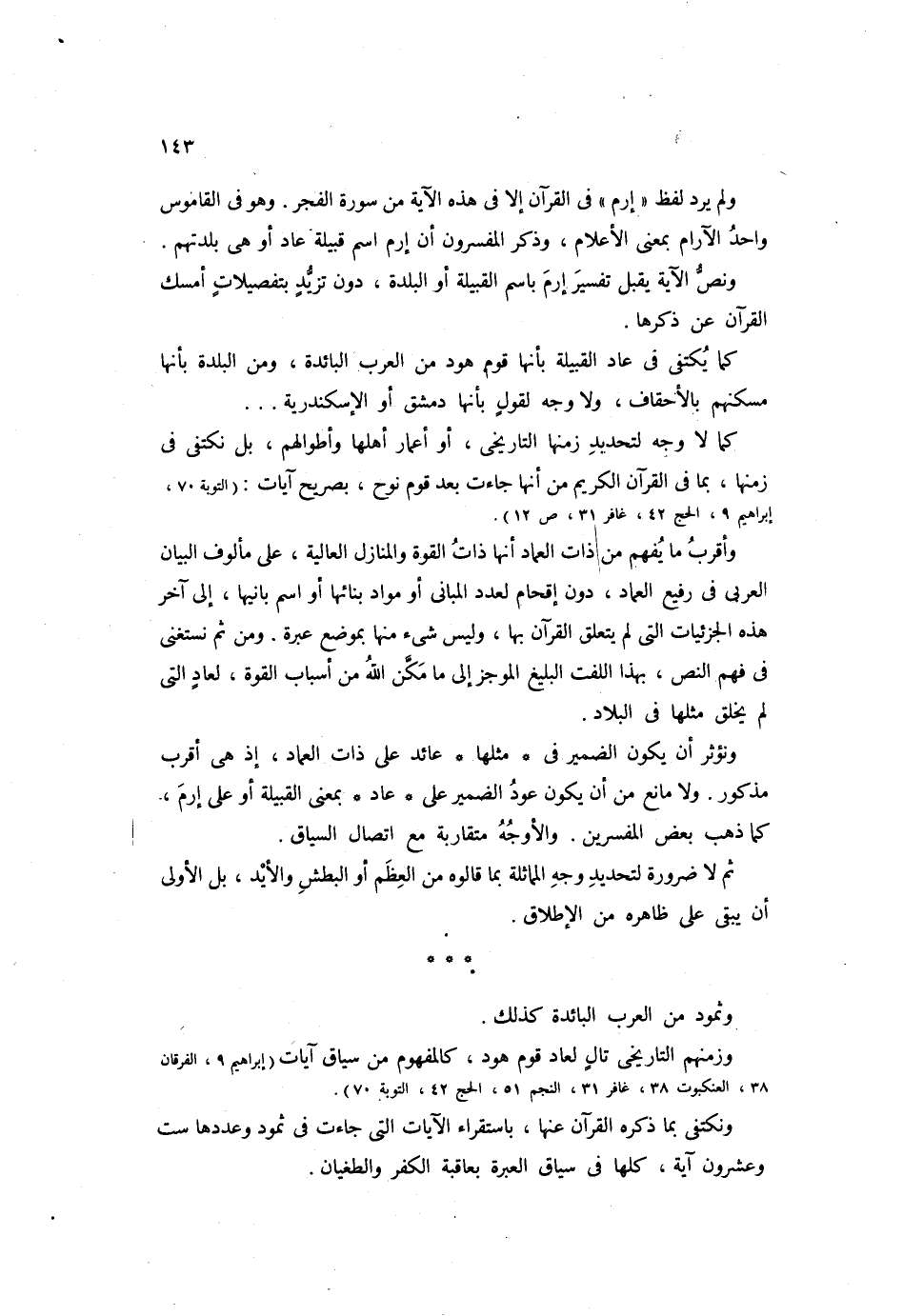 كما يكتفي في عاد القبيلة بأنها قوم هود من العرب البائدة، ومن البلدى بأنها مسكنهم بالأحقاف، ولا وجه لقول بأنها دمشق أو الإسكندرية ...