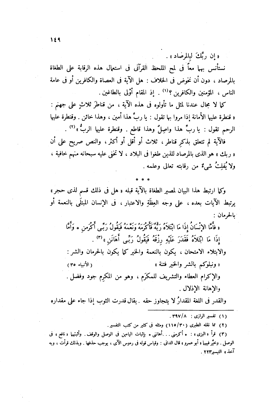 نستأنس بهما معاً في لمح الملحظ القرآني في استعمال هذه الرقابة على الطغاة بالمرصاد، دون أن نخوض في الخلاف: هل الآية في العصاة والكافرين أو في عامة الناس، المؤمنين والكافرين؟. إذ المقام أولى بالطاغين.