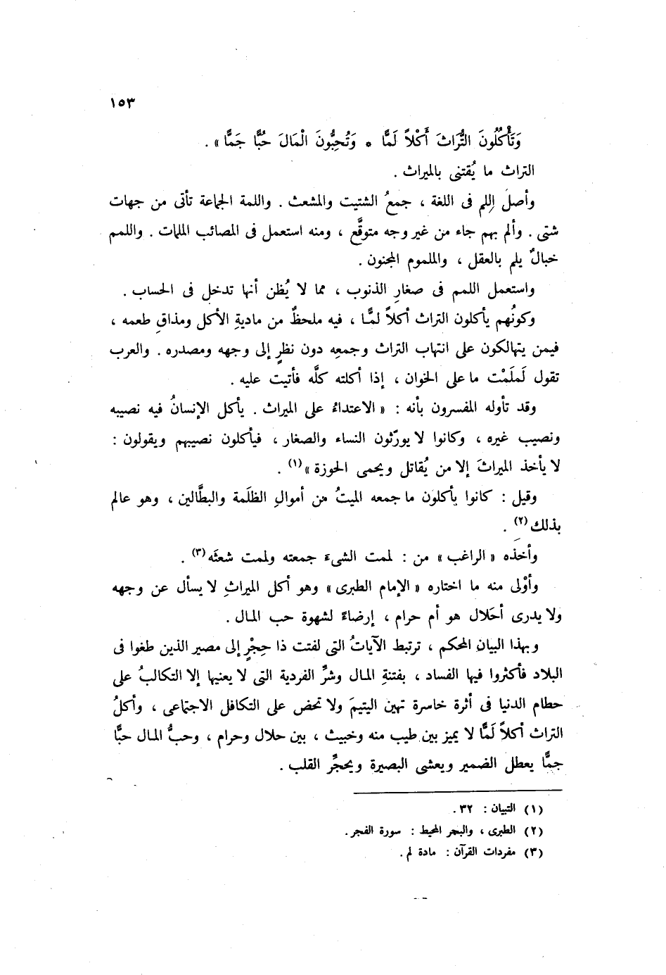 وكونهم يأكلون التراث أكلاً لماً، فيه ملحظ من مادية الأكل ومذاق طعمه، فيمن يتهالكون على انتهاب التراث وجمعه دون نظر إلى وجهه ومصدره. والعرب تقول لملمت ما على الخوان، إذا أكلته كله فأتيت عليه.