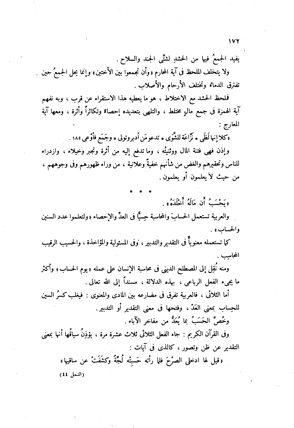 والعربية تستعمل الحساب والمحاسبة حسياً في العد والإحصاء {وَلِتَعْلَمُوا عَدَدَ السِّنِينَ وَالْحِسَابَ} .