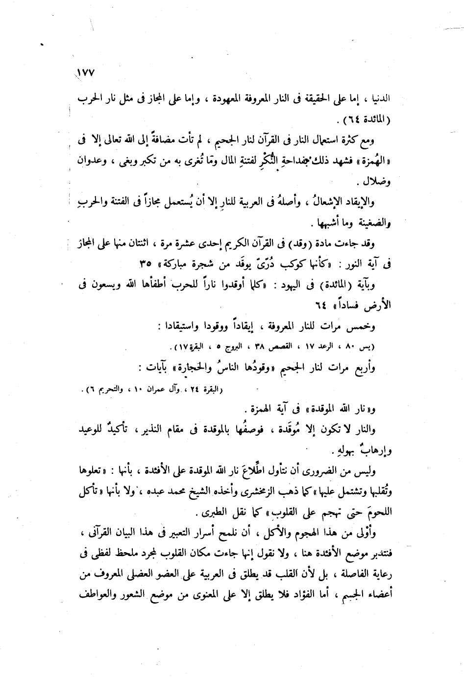 وأولى من هذا الهجوم والأكل، أن نامح أسرار التعبير في هذا البيان القرآني، فنتدبر موضع الأفئدة هنا، ولا نقول إنها جاءت مكان القلوب لمجرد ملحظ لفظي في رعاية الفاصلة، بل لأن القلب قد يطلق في العربية على العضو العضلي المعروف من أعضاء الجسم، أما الفؤاد فلا يطلق إلا على المعنوي من وضع الشعور والعواطف