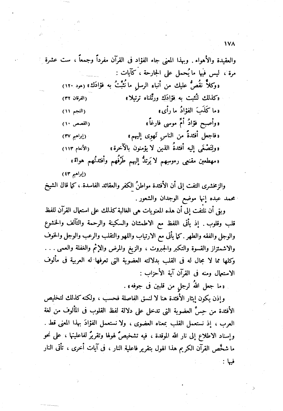 وإذن يكون إيثار الأفئدة هنا لا لنسق الفاصلة فحسب، ولكنه كذلك لتخليض الأفئدة من حس العضوية التي تدخل على دلالة لفظ القلوب في المألوف من لغة العرب، إذ نستعمل القلب بمعناه العضوي، ولا نستعمل الفؤاد بهذا المعنى قط.