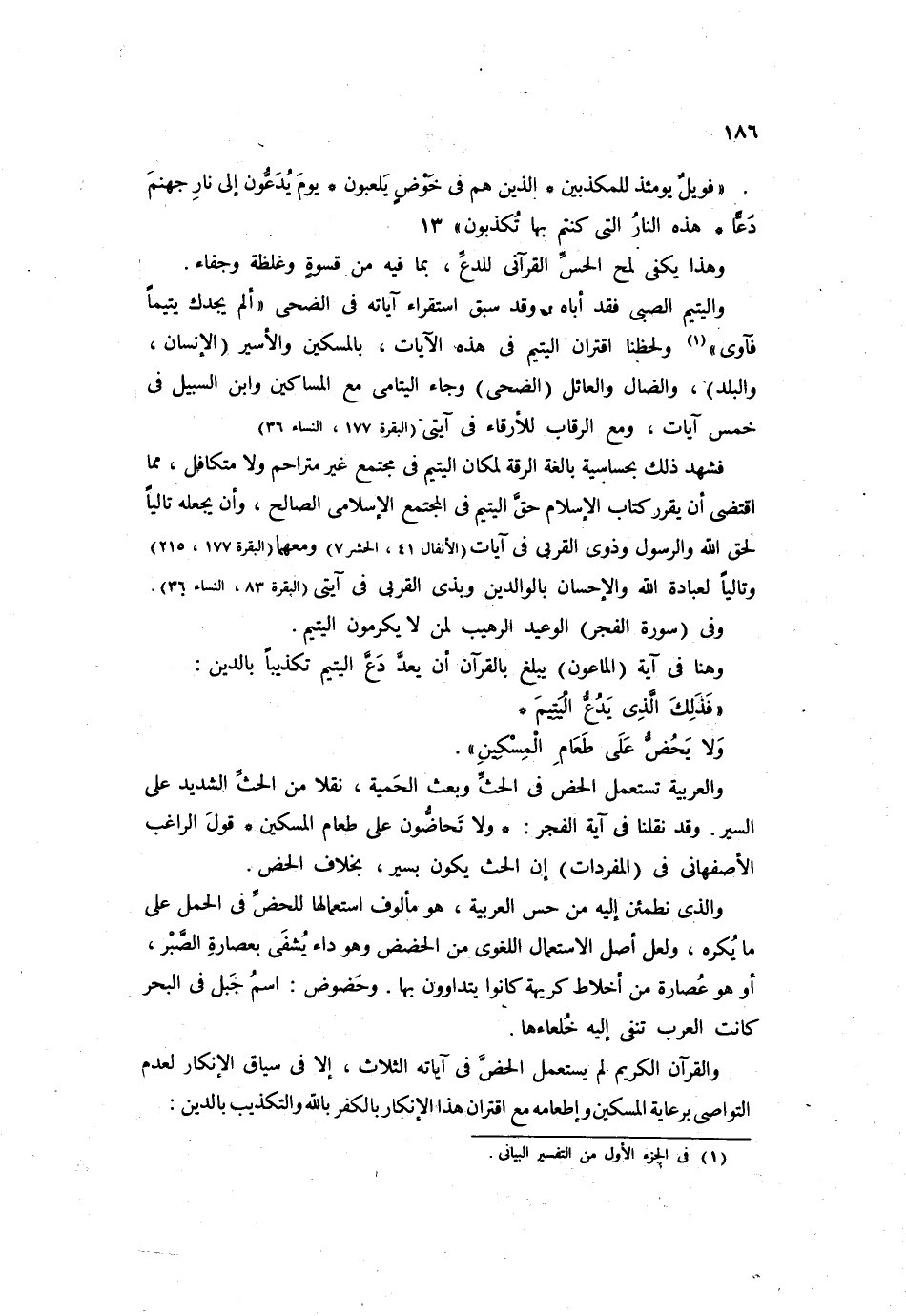 فشهد ذلك بحساسية بالغة الرقة لمكان اليتيم في مجتمع غير متراحم ولا متكافل، مما اقتضى أن يقرر كتاب الإسلام حق اليتيم في المجتمع الإسلامي الصالح، وأن يجعله تالياً لحق الله والرسول وذوي القربي في آيات (الأنفال 41، الحشر 7) ومعهما (البقرة 177، 215) وتالياً لعبادة الله والإحسان بالوالدين وبذي القربي في آيتى (البقرة 83، النساء 36) .