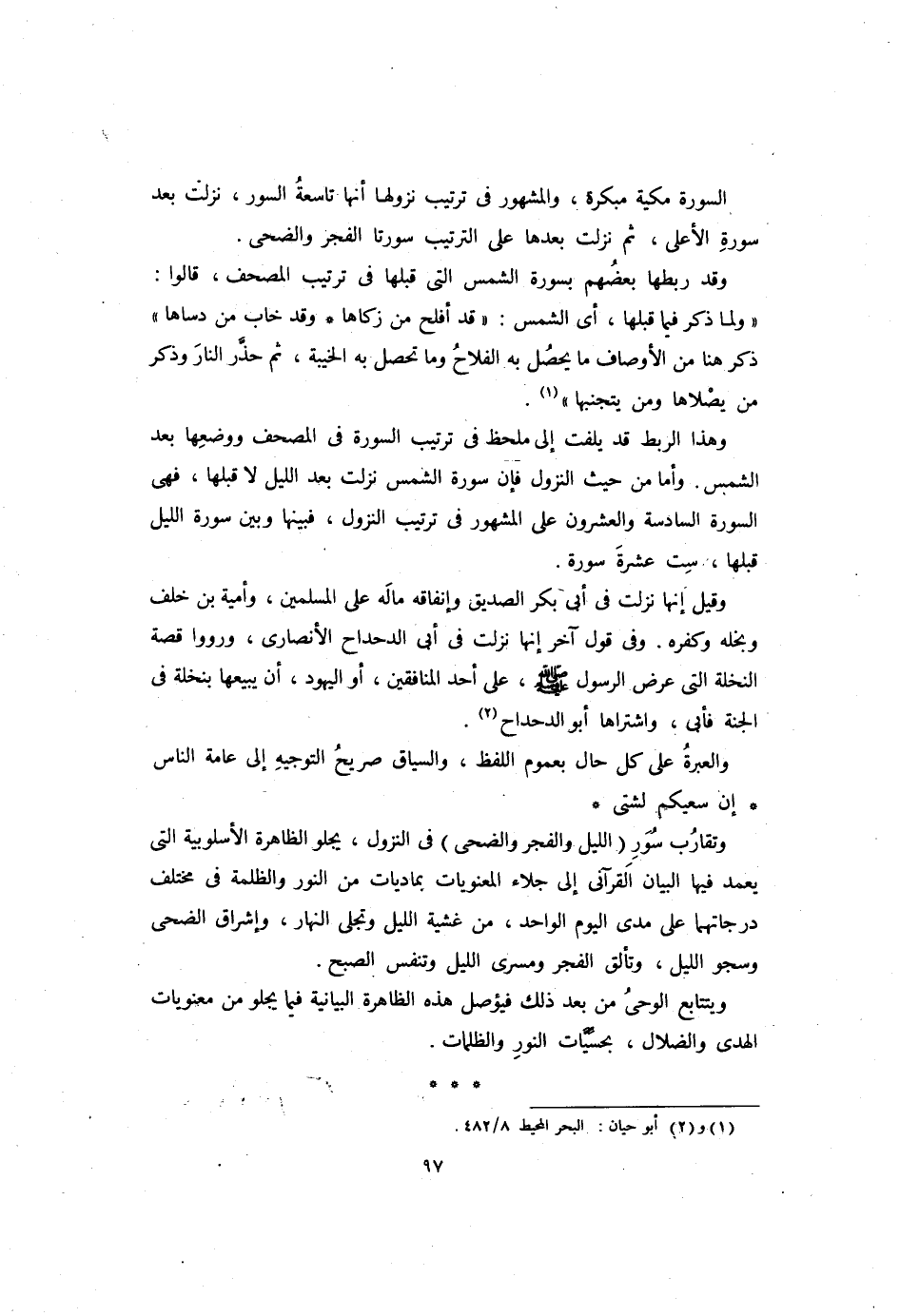 وتقارب سور (الليل والفجر والضحى) في النزول، يجلو الظاهرة الأسلوبية التي يعمد فيها البيان القرآني إلى جلاء المعنويات بماديات من النور والظلمة في مختلف درجاتهما على مدى اليوم الواحد، من غشية الليل وتجلي النهار، وإشراق الضحى وسجو الليل، وتألق الفجر ومسرى الليل وتنفس الصبح.
