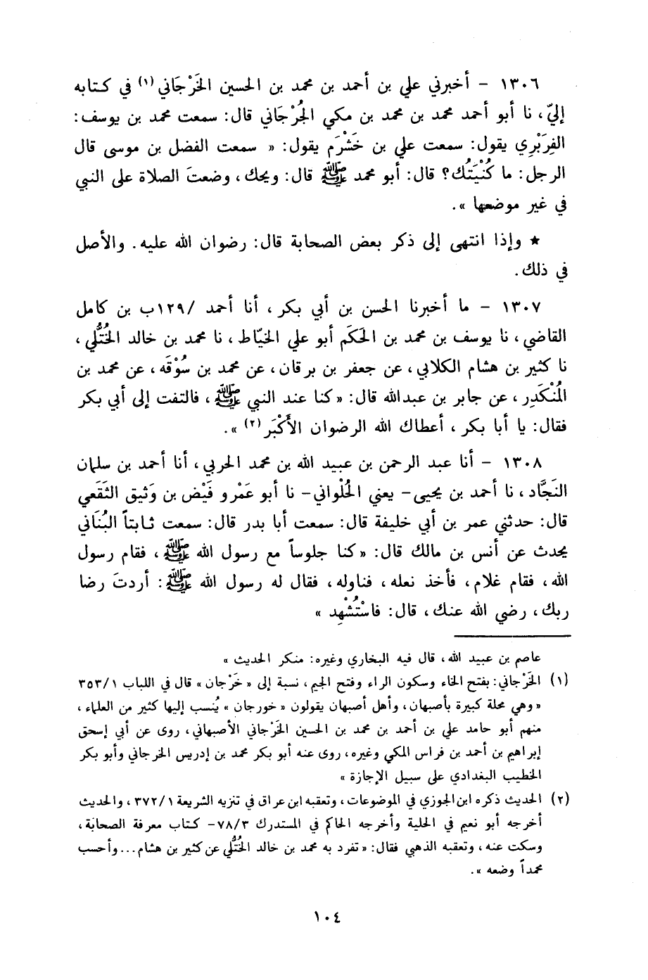 1306 - أَخْبَرَنِي عَلِيُّ بْنُ أَحْمَدَ بْنِ مُحَمَّدِ بْنِ الْحُسَيْنِ الْخَرْجَانِيُّ، فِي كِتَابِهِ إِلَيَّ نا أَبُو أَحْمَدَ مُحَمَّدُ بْنُ مُحَمَّدِ بْنِ مَكِّيٍّ الْجُرْجَانِيُّ قَالَ: سَمِعْتُ مُحَمَّدَ بْنَ يُوسُفَ الْفَرَبْرِيَّ، يَقُولُ: سَمِعْتُ عَلِيَّ بْنَ خَشْرَمٍ، يَقُولُ: سَمِعْتُ الْفَضْلَ بْنَ مُوسَى، قَالَ لِرَجُلٍ: «§مَا كُنْيَتُكَ؟» قَالَ: أَبُو مُحَمَّدٍ صَلَّى اللهُ عَلَيْهِ وَسَلَّمَ، قَالَ: «وَيْحَكَ، وَضَعْتَ الصَّلَاةَ عَلَى النَّبِيِّ فِي غَيْرِ مَوضِعْهَا» وَإِذَا انْتَهَى إِلَى ذِكْرِ بَعْضِ الصَّحَابَةِ قَالَ: رِضْوَانُ اللَّهِ عَلَيْهِ وَالْأَصْلُ فِي ذَلِكَ
