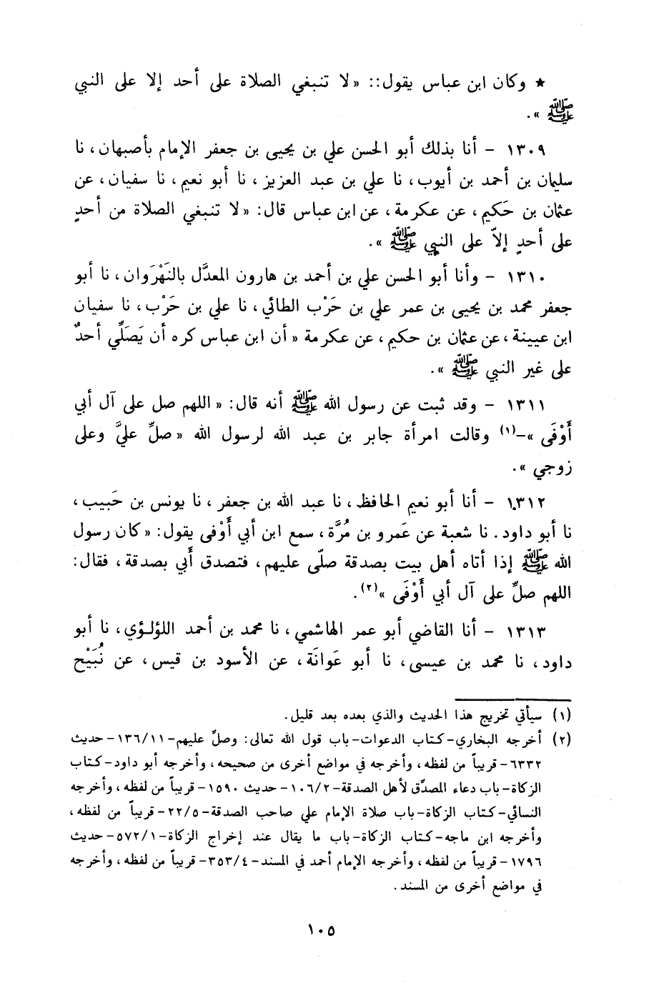 1309 - أنا بِذَلِكَ أَبُو الْحَسَنِ عَلِيُّ بْنُ يَحْيَى بْنِ جَعْفَرٍ الْإِمَامُ بِأَصْبَهَانَ نا سُلَيْمَانُ بْنُ أَحْمَدَ بْنِ أَيُّوبَ، نا عَلِيُّ بْنُ عَبْدِ الْعَزِيزِ، نا أَبُو نُعَيْمٍ، نا سُفْيَانُ، عَنْ عُثْمَانَ بْنِ حَكِيمٍ، عَنْ عِكْرِمَةَ، عَنِ ابْنِ عَبَّاسٍ، قَالَ: §«لَا تَنْبَغِي الصَّلَاةُ مِنْ أَحَدٍ عَلَى أَحَدٍ إِلَّا عَلَى النَّبِيِّ صَلَّى اللهُ عَلَيْهِ وَسَلَّمَ»