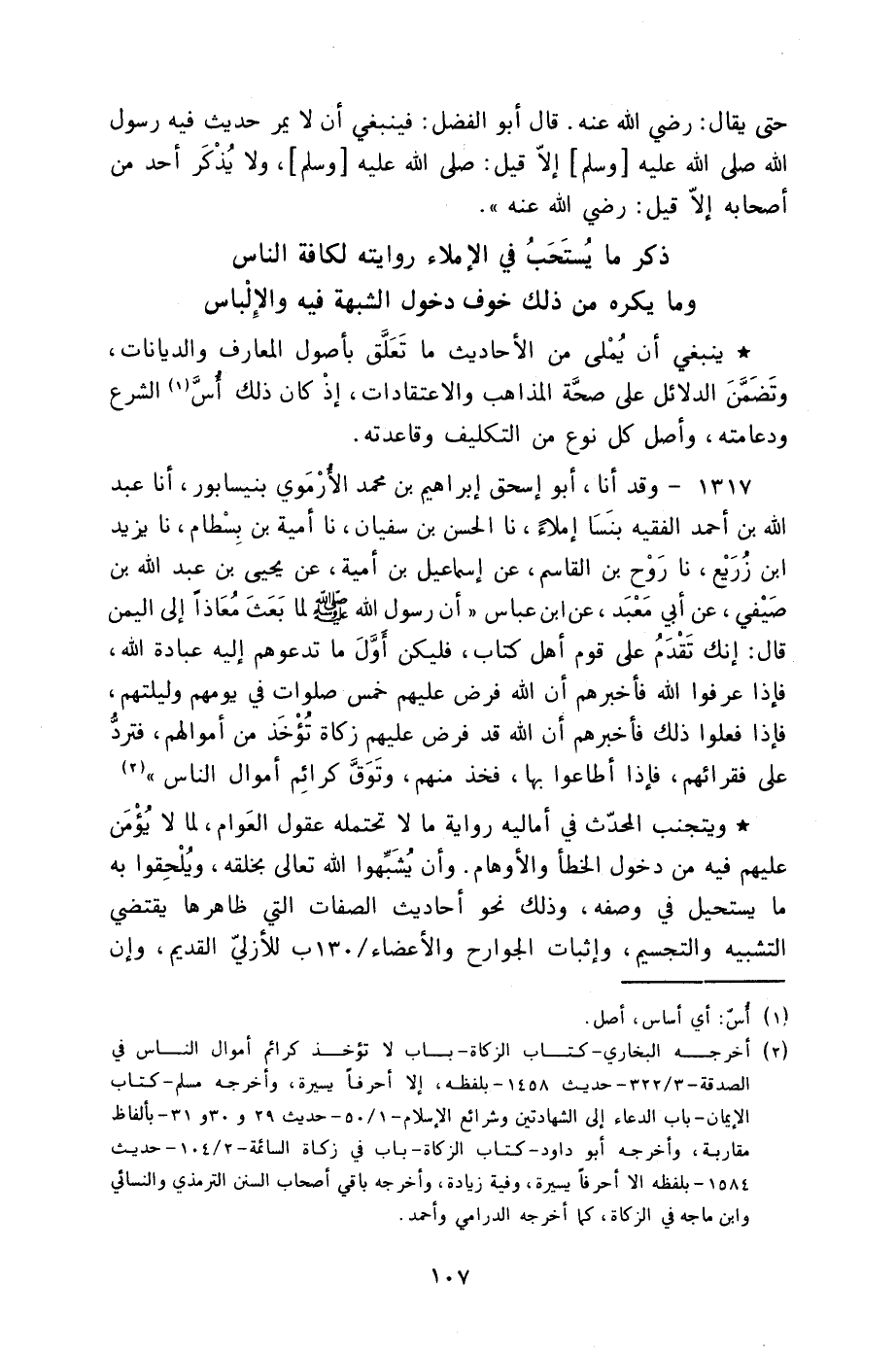 1317 - وَقَدْ أنا أَبُو إِسْحَاقَ إِبْرَاهِيمُ بْنُ مُحَمَّدٍ الْأَرَمَوِيُّ بِنَيْسَابُورَ أنا عَبْدُ اللَّهِ بْنُ أَحْمَدَ الْفَقِيهُ بِنَسَا إِمْلَاءً نا الْحَسَنُ بْنُ سُفْيَانَ، نا أُمَيَّةُ بْنُ بِسْطَامٍ، نا يَزِيدُ بْنُ زُرَيْعٍ، نا رَوْحُ بْنُ الْقَاسِمِ، عَنْ إِسْمَاعِيلَ بْنِ أُمَيَّةَ، عَنْ يَحْيَى بْنِ عَبْدِ اللَّهِ بْنِ صَيْفِيٍّ، عَنْ أَبِي مَعْبَدٍ، عَنِ ابْنِ عَبَّاسٍ، أَنَّ رَسُولَ اللَّهِ صَلَّى اللهُ عَلَيْهِ وَسَلَّمَ لَمَّا بَعَثَ مُعَاذًا إِلَى الْيَمَنِ قَالَ: §«إِنَّكَ تَقْدُمُ عَلَى قَوْمٍ أَهْلِ كِتَابٍ فَلْيَكُنْ أَوَّلُ مَا تَدْعُوهُمْ إِلَيْهِ عِبَادَةَ اللَّهِ فَإِذَا عَرَفُوا اللَّهَ فَأَخْبِرْهُمْ أَنَّ اللَّهَ فَرَضَ عَلَيْهِمْ خَمْسَ صَلَوَاتٍ فِي يَوْمِهِمْ وَلَيْلَتِهِمْ فَإِذَا فَعَلُوا ذَلِكَ فَأَخْبِرْهُمْ أَنَّ اللَّهَ قَدْ فَرَضَ عَلَيْهِمْ زَكَاةً تُؤْخَذُ مِنْ أَمْوَالِهِمْ فَتُرَدُّ عَلَى فُقَرَائِهِمْ فَإِذَا أَطَاعُوا بِهَا فَخُذْ مِنْهُمْ وَتَوَقَّ كَرَائِمَ أَمْوَالِ النَّاسِ» وَيَتَجَنَّبُ الْمُحَدِّثُ فِي أَمَالِيهِ رِوَايَةِ مَا لَا تَحْتَمِلُهُ عُقُولُ الْعَوَامِّ لِمَا لَا يُؤْمَنُ عَلَيْهِمْ فِيهِ مِنْ دُخُولِ الْخَطَأِ وَالْأَوْهَامِ وَأَنْ يُشَبِّهُوا اللَّهَ تَعَالَى بِخَلْقِهِ وَيُلْحِقُوا بِهِ مَا يَسْتَحِيلُ فِي وَصْفِهِ وَذَلِكَ نَحْوُ أَحَادِيثِ الصِّفَاتِ الَّتِي ظَاهِرُهَا يَقْتَضِي التَّشْبِيهَ وَالتَّجْسِيمَ وَإِثْبَاتَ الْجَوَارحِ وَالْأَعْضَاءِ لِلْأَزَلِيِّ الْقَدِيمِ وَإِنْ -[108]- كَانَتِ الْأَحَادِيثُ صِحَاحًا وَلَهَا فِي التَّأْوِيلِ طُرُقٌ وَوُجُوهٌ إِلَّا أَنَّ مِنَ حَقِّهَا أَنْ لَا تُرْوَى إِلَّا لِأَهْلِهَا خَوْفًا مِنْ أَنْ يُضَلَّ بِهَا مَنْ جَهِلَ مَعَانِيَهَا فَيَحْمِلُهَا عَلَى ظَاهِرِهَا أَوْ يَسْتَنْكِرُهَا فَيَرُدَّهَا وَيُكَذِّبُ رِوَاتِهَا وَنَقَلَتَهَا