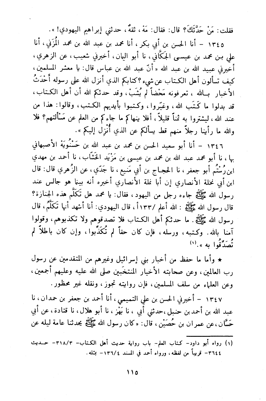 1346 - أنا أَبُو سَعِيدٍ الْحَسَنُ بْنُ مُحَمَّدِ بْنِ عَبْدِ اللَّهِ بْنِ حَسْنَوَيْهِ الْأَصْبَهَانِيُّ، بِهَا، نا أَبُو مُحَمَّدٍ عَبْدُ اللَّهِ بْنُ مُحَمَّدِ بْنِ عِيسَى بْنِ مَزْيَدٍ الْخَشَّابُ، نا أَحْمَدُ بْنُ مَهْدِيِّ بْنِ رُسْتُمَ أَبُو جَعْفَرٍ، نا الْحَجَّاجُ بْنُ أَبِي مَنِيعٍ، نا جَدِّي، عَنِ الزُّهْرِيِّ، قَالَ: قَالَ ابْنُ أَبِي نَخْلَةَ الْأَنْصَارِي: إِنَّ أَبَا نَمْلَةَ الْأَنْصَارِيَّ أَخْبَرَهُ أَنَّهُ بَيْنَمَا هُوَ جَالِسٌ عِنْدَ رَسُولِ اللَّهِ صَلَّى اللهُ عَلَيْهِ وَسَلَّمَ جَاءَهُ رَجُلٌ مِنَ الْيَهُودِ فَقَالَ: يَا مُحَمَّدُ هَلْ تَكَلَّمُ هَذِهِ الْجَنَازَةُ قَالَ: رَسُولُ اللَّهِ صَلَّى اللهُ عَلَيْهِ وَسَلَّمَ: اللَّهُ أَعْلَمُ. قَالَ الْيَهُودِيُّ أَنَا أَشْهَدُ أَنَّهَا تَكَلَّمُ قَالَ رَسُولُ اللَّهِ صَلَّى اللهُ عَلَيْهِ وَسَلَّمَ: §«مَا حَدَّثَكُمْ أَهْلُ الْكِتَابِ فَلَا تُصَدِّقُوهُمْ وَلَا تُكَذِّبُوهُمْ وَقُولُوا آمَنَّا بِاللَّهِ وَكُتُبِهِ وَرُسُلِهِ فَإِنْ كَانَ حَقًّا لَمْ تَكْذِبُوا وَإِنْ كَانَ بَاطِلًا لَمْ تُصَدِّقُوا بِهِ» وَأَمَّا مَا حُفِظَ مِنْ أَخْبَارِ بَنِي إِسْرَائِيلَ وَغَيْرِهِمْ مِنَ الْمُتَقَدِّمِينَ عَنْ رَسُولِ رَبِّ الْعَالَمِينَ وَعَنْ صَحَابَتِهِ الْأَخْيَارِ الْمُنْتَخَبِينَ صَلَّى اللَّهُ عَلَيْهِ وَعَلَيْهِمْ أَجْمَعِينَ وَعَنِ الْعُلَمَاءِ مِنْ سَلَفِ الْمُسْلِمِينَ فَإِنَّ رِوَايَتَهُ تَجُوزُ وَنَقْلَهُ غَيْرُ مَحْظُورٍ