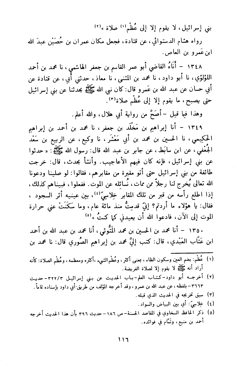 1348 - أَنَاهُ الْقَاضِي أَبُو عُمَرَ الْقَاسِمُ بْنُ جَعْفَرٍ الْهَاشِمِيُّ نا مُحَمَّدُ بْنُ أَحْمَدَ اللُّؤْلُؤِيُّ، نا أَبُو دَاوُدَ، نا مُحَمَّدُ بْنُ الْمُثَنَّى، نا مُعَاذٌ، حَدَّثَنِي أَبِي، عَنْ قَتَادَةَ، عَنْ أَبِي حَسَّانَ، عَنْ عَبْدِ اللَّهِ بْنِ عَمْرٍو، قَالَ: §«كَانَ نَبِيُّ اللَّهِ صَلَّى اللهُ عَلَيْهِ وَسَلَّمَ يُحَدِّثُنَا عَنْ بَنِي إِسْرَائِيلَ حَتَّى يُصْبِحَ مَا يَقُومُ إِلَّا إِلَى عُظْمِ صَلَاةٍ» وَهَذَا فِيمَا قِيلَ أَصَحُّ مِنْ رِوَايَةِ أَبِي هِلَالٍ وَاللَّهُ أَعْلَمُ