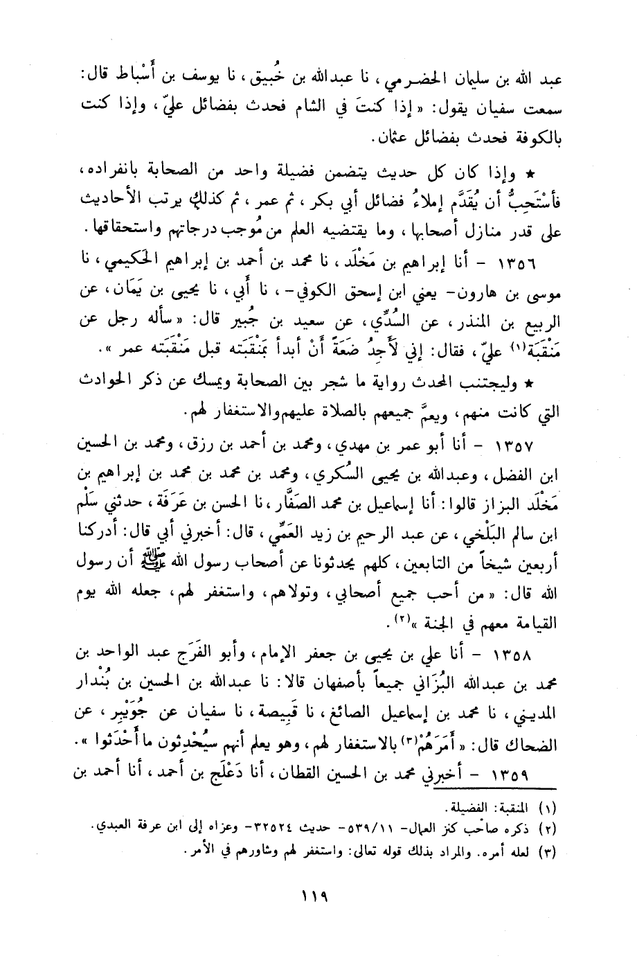 1356 - أنا إِبْرَاهِيمُ بْنُ مَخْلَدٍ، نا مُحَمَّدُ بْنُ أَحْمَدَ بْنِ إِبْرَاهِيمَ الْحَكِيمِيُّ، نا مُوسَى بْنُ هَارُونَ يَعْنِي ابْنَ إِسْحَاقَ الْكُوفِيَّ، نا أَبِي، نا يَحْيَى بْنُ يَمَانٍ، عَنِ الرَّبِيعِ بْنِ الْمُنْذِرِ، عَنِ السُّدِّيِّ، عَنْ سَعِيدِ بْنِ جُبَيْرٍ قَالَ: سَأَلَهُ رَجُلٌ عَنْ مَنْقَبَةِ عَلِيٍّ فَقَالَ: §«إِنِّي لَأَجِدُ ضَعَةً أَنْ أَبْدَأَ بِمَنْقَبَتِهِ قَبْلُ مَنْقَبَةِ عُمَرُ» وَلْيَجْتَنِبِ الْمُحَدِّثُ رِوَايَةَ مَا شَجَرَ بَيْنَ الصَّحَابَةِ وَيُمْسِكُ عَنْ ذِكْرِ الْحَوَادِثِ الَّتِي كَانَتْ مِنْهُمْ وَيُعِمُّ جَمِيعَهُمْ بِالصَّلَاةِ عَلَيْهِمْ وَالِاسْتِغْفَارِ لَهُمْ