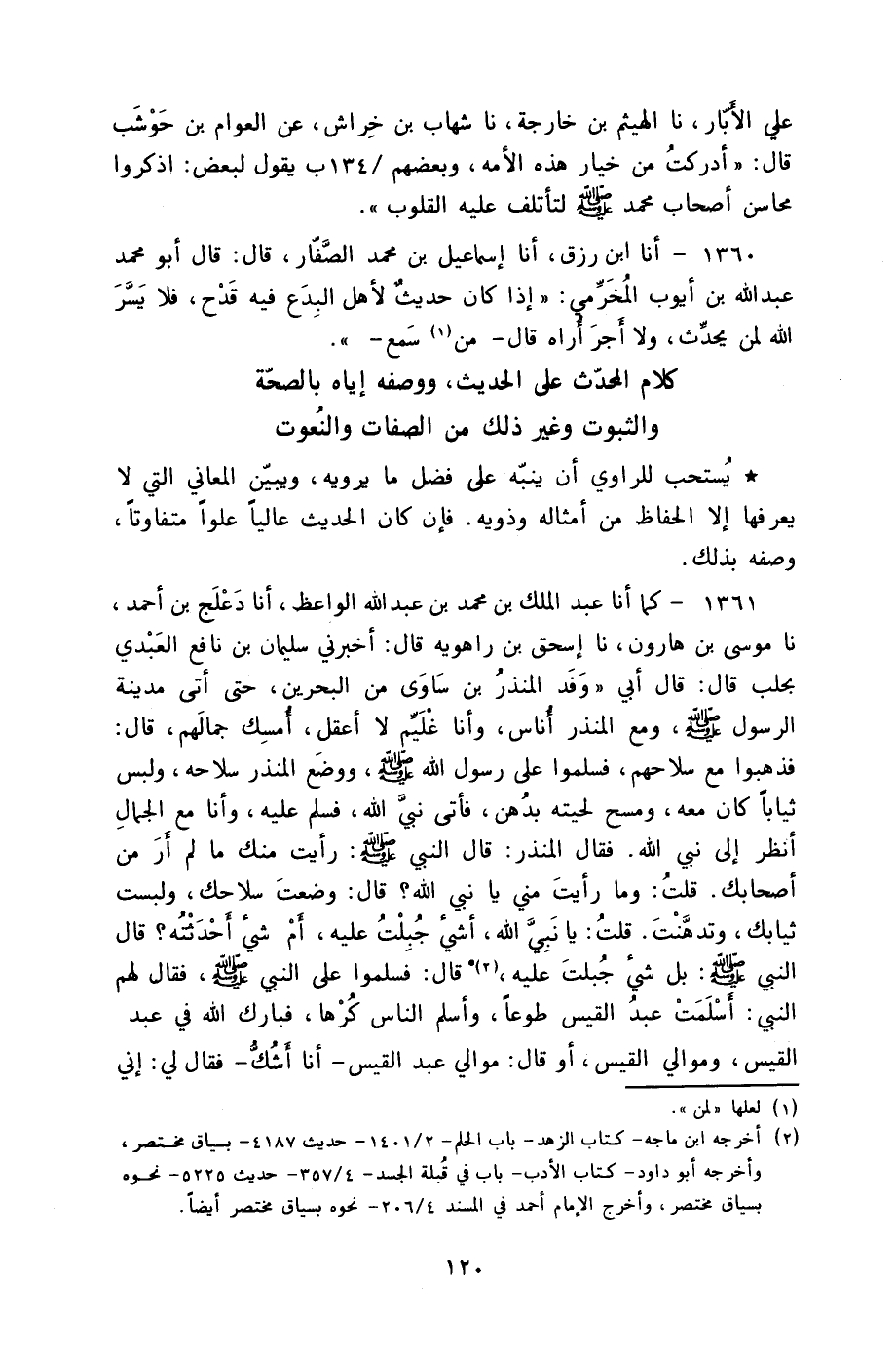 1361 - كَمَا أنا عَبْدُ الْمَلِكِ بْنُ مُحَمَّدِ بْنِ عَبْدِ اللَّهِ الْوَاعِظُ، أنا دَعْلَجُ بْنُ أَحْمَدَ، نا مُوسَى بْنُ هَارُونَ، نا إِسْحَاقُ بْنُ رَاهَوَيْهِ، قَالَ: أَخْبَرَنِي سُلَيْمَانُ بْنُ نَافِعٍ الْعَبْدِيُّ، بِحَلَبَ قَالَ: قَالَ أَبِي: وَفَدَ الْمُنْذِرُ بْنُ سَاوَى مِنَ الْبَحْرَيْنِ حَتَّى أَتَى مَدِينَةَ الرَّسُولِ صَلَّى اللهُ عَلَيْهِ وَسَلَّمَ وَمَعَ الْمُنْذِرِ أُنَاسٌ وَأَنَا غُلَيِّمٌ لَا أَعْقِلُ أَمْسِكُ جِمَالَهُمْ، قَالَ: فَذَهَبُوا مَعَ سِلَاحِهِمْ فَسَلَّمُوا عَلَى رَسُولِ اللَّهِ صَلَّى اللهُ عَلَيْهِ وَسَلَّمَ وَوَضَعَ الْمُنْذِرُ سِلَاحَهُ وَلَبِسَ ثِيَابًا كَانَ مَعَهُ وَمَسَحَ لِحْيَتَهُ بِدُهْنٍ فَأَتَى نَبِيَّ اللَّهِ فَسَلَّمَ عَلَيْهِ وَأَنَا مَعَ الْجِمَالِ أَنْظُرُ إِلَى نَبِيِّ اللَّهِ فَقَالَ الْمُنْذِرُ: قَالَ النَّبِيُّ صَلَّى اللهُ عَلَيْهِ وَسَلَّمَ: «§رَأَيْتُ مِنْكَ مَا لَمْ أَرَ مِنْ أَصْحَابِكَ» . قُلْتُ: وَمَا رَأَيْتَ مِنِّي يَا نَبِيَّ اللَّهِ؟ قَالَ: «وَضَعْتَ سِلَاحَكَ، وَلَبِسْتَ ثِيَابَكَ، وَتَدَهَّنْتَ» قُلْتُ: يَا نَبِيَّ اللَّهِ، أَشَيْءٌ جُبِلْتُ عَلَيْهِ أَمْ شَيْءٌ أَحْدَثْتُهُ؟ قَالَ النَّبِيُّ صَلَّى اللهُ عَلَيْهِ وَسَلَّمَ: «بَلْ شَيْءٌ جُبِلْتَ عَلَيْهِ» قَالَ: فَسَلَّمُوا عَلَى النَّبِيِّ صَلَّى اللهُ عَلَيْهِ وَسَلَّمَ فَقَالَ لَهُمُ النَّبِيُّ: «أَسْلَمَتْ عَبْدُ الْقَيْسِ طَوْعًا وَأَسْلَمَ النَّاسُ كُرْهًا، فَبَارَكَ اللَّهُ فِي عَبْدِ الْقَيْسِ وَمَوَالِي الْقَيْسِ» أَوْ قَالَ: مَوَالِي عَبْدِ الْقَيْسِ أَنَا أَشُكُّ فَقَالَ لِي: إِنِّي -[121]- نَظَرْتُ إِلَى النَّبِيِّ صَلَّى اللهُ عَلَيْهِ وَسَلَّمَ كَمَا أَنِّي أَنْظُرُ إِلَيْكَ وَلَكِنِّي لَمْ أَعْقِلْ، قَالَ: وَمَاتَ أَبِي وَهُوَ ابْنُ عِشْرِينَ وَمِائَةٍ سَنَةٍ " قَالَ مُوسَى بْنُ هَارُونَ: لَيْسَ عِنْدَ إِسْحَاقَ بْنِ رَاهَوَيْهِ حَدِيثٌ أَرْفَعُ مِنْ هَذَا. وَهَذَا الْقَوْلُ صَحِيحٌ لِأَنَّ إِسْحَاقَ لَمْ يَلْقَ مَنْ حَدَّثَهُ عَمَّنْ شَاهِدَ رَسُولَ اللَّهِ صَلَّى اللهُ عَلَيْهِ وَسَلَّمَ غَيْرَ هَذَا الرَّجُلِ فَقَدْ دَخَلَ بِهِ إِسْحَاقُ فِي جُمْلَةِ الْقَرْنِ الثَّالِثِ وَحَصَلَ لَهُ فَضِيلَةٌ قَوْلُ النَّبِيِّ صَلَّى اللهُ عَلَيْهِ وَسَلَّمَ: «خَيْرُ النَّاسِ قَرْنِي ثُمَّ الَّذِينَ يَلُونَهُمْ ثُمَّ الَّذِينَ يَلُونَهُمْ»