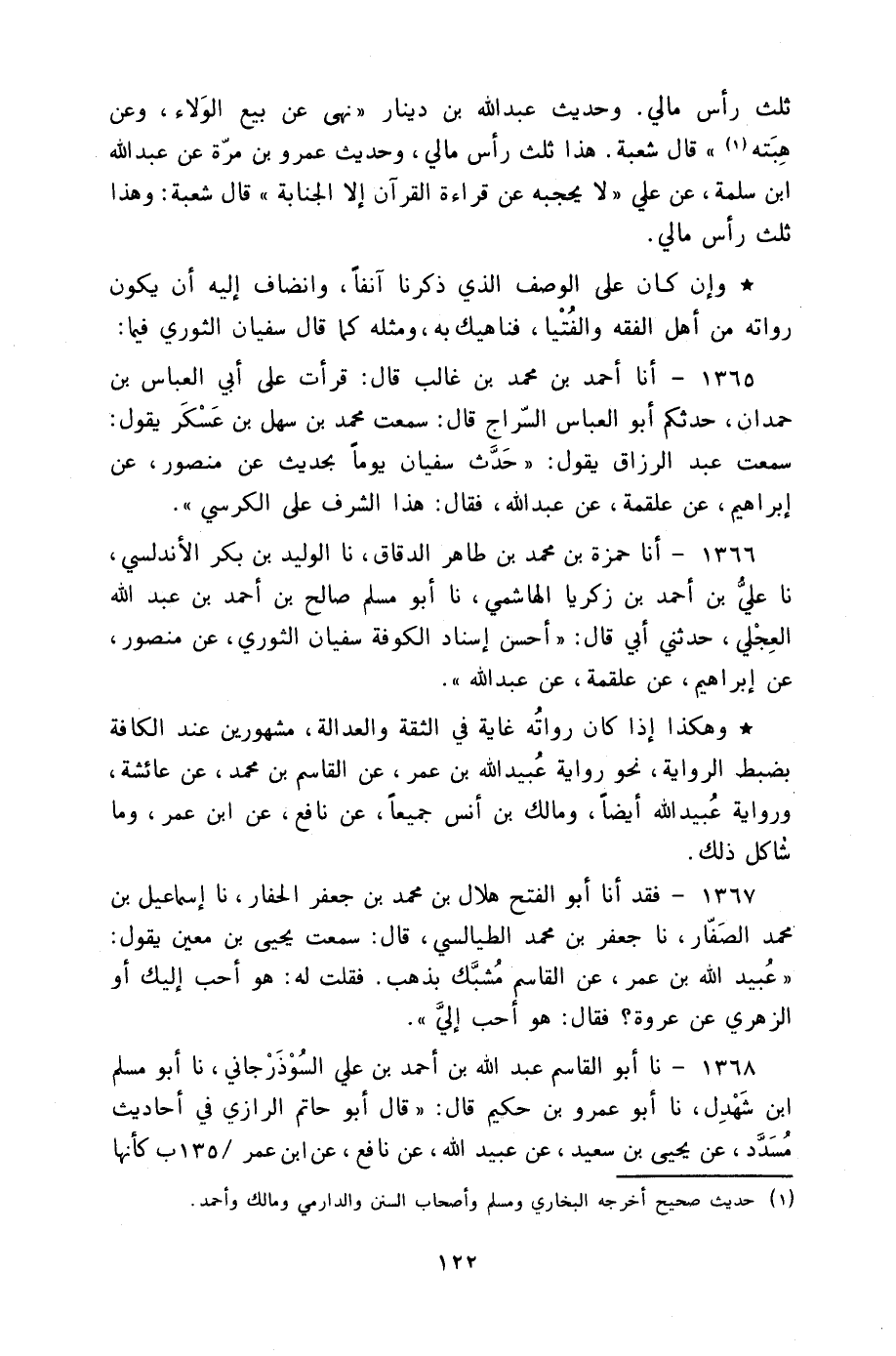 1366 - أنا حَمْزَةُ بْنُ مُحَمَّدِ بْنِ طَاهِرٍ الدَّقَّاقُ، نا الْوَلِيدُ بْنُ بَكْرٍ الْأَنْدَلُسِيُّ، نا عَلِيُّ بْنُ أَحْمَدَ بْنِ زَكَرِيَّا الْهَاشِمِيُّ، نا أَبُو مُسْلِمٍ صَالِحُ بْنُ أَحْمَدَ بْنِ عَبْدِ اللَّهِ الْعِجْلِيُّ حَدَّثَنِي أَبِي قَالَ: «§أَحْسَنُ إِسْنَادِ الْكُوفَةِ سُفْيَانُ الثَّوْرِيُّ، عَنْ مَنْصُورٍ، عَنْ إِبْرَاهِيمَ، عَنْ عَلْقَمَةَ، عَنْ عَبْدِ اللَّهِ» وَهَكَذَا إِذَا كَانَ رُوَاتُهُ غَايَةً فِي الثِّقَةِ وَالْعَدَالَةِ مَشْهُورِينَ عِنْدَ الْكَافَّةِ بِضَبْطِ الرِّوَايَةِ نَحْوُ رِوَايَةِ عُبَيْدِ اللَّهِ بْنِ عُمَرَ عَنِ الْقَاسِمِ بْنِ مُحَمَّدٍ عَنْ عَائِشَةَ، وَرِوَايَةِ عُبَيْدِ اللَّهِ أَيْضًا وَمَالِكِ بْنِ أَنَسٍ جَمِيعًا عَنْ نَافِعٍ عَنِ ابْنِ عُمَرَ وَمَا شَاكَلَ ذَلِكَ