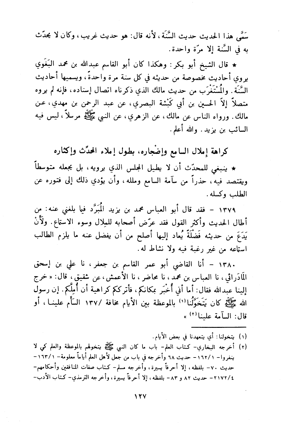 §كَرَاهَةُ إِمْلَالِ السَّامِعِ وَإِضْجَارِهِ بِطُولِ إِمْلَاءِ الْمُحَدِّثِ وَإِكْثَارِهِ يَنْبَغِي لِلْمُحَدِّثِ أَنْ لَا يُطِيلَ الْمَجْلِسَ الَّذِي يَرْوِيهِ بَلْ يَجْعَلُهُ مُتَوَسِّطًا وَيَقْتَصِدُ فِيهِ حَذَرًا مِنْ سَآمَةِ السَّامِعِ وَمَلَلِهِ وَأَنْ يُؤَدِّيَ ذَلِكَ إِلَى فُتُورِهِ عَنِ الطَّلَبِ وَكَسَلِهِ
