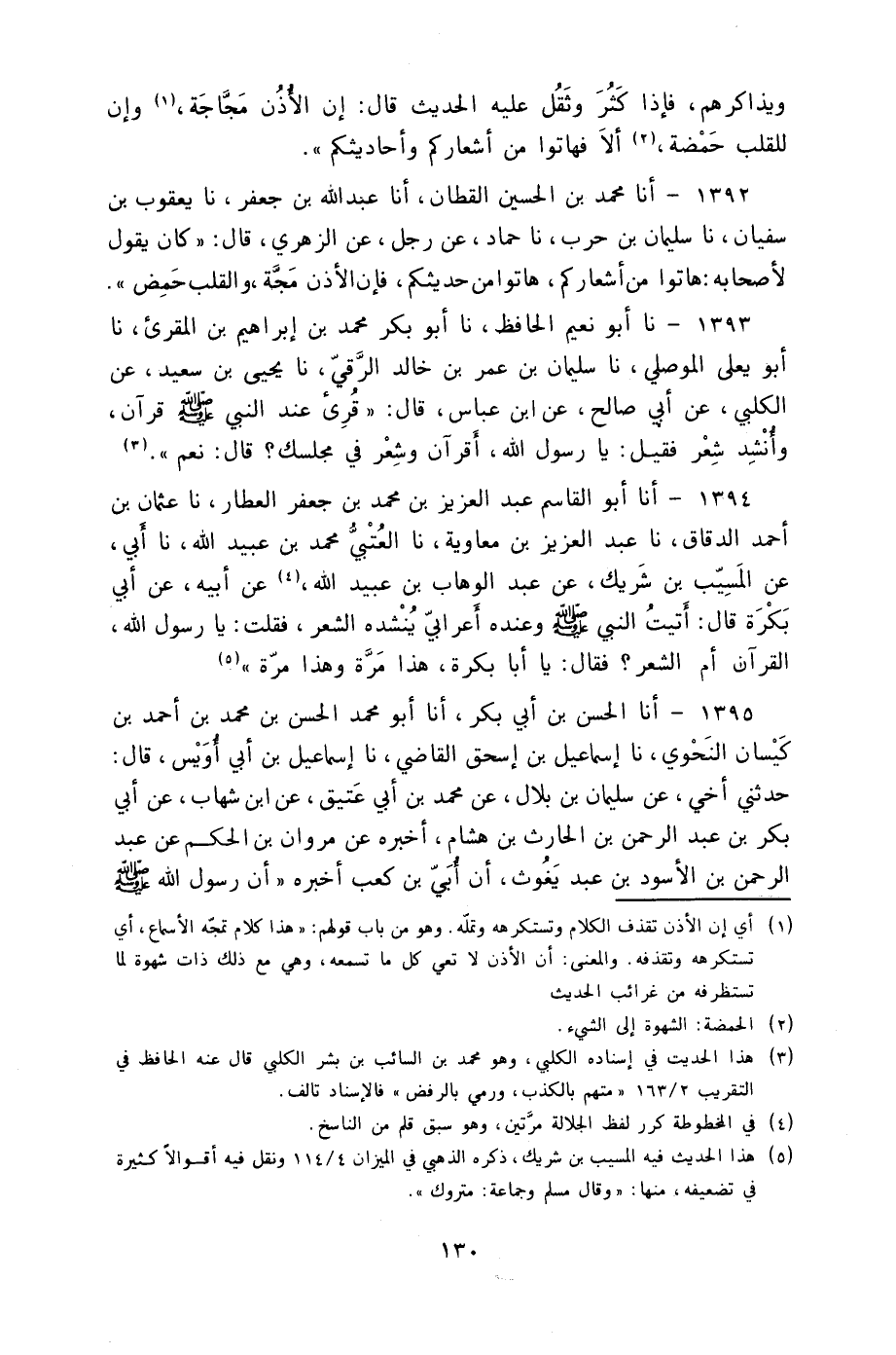 1392 - أنا مُحَمَّدُ بْنُ الْحُسَيْنِ الْقَطَّانُ، أنا عَبْدُ اللَّهِ بْنُ جَعْفَرٍ، نا يَعْقُوبُ بْنُ سُفْيَانَ، نا سُلَيْمَانُ بْنُ حَرْبٍ، نا حَمَّادٌ، عَنْ رَجُلٍ، عَنِ الزُّهْرِيِّ، قَالَ: كَانَ يَقُولُ لِأَصْحَابِهِ: §«هَاتُوا مِنْ أَشْعَارِكُمْ هَاتُوا مِنْ حَدِيثِكُمْ فَإِنَّ الْأُذُنَ مَجَّةٌ وَالْقَلْبَ حَمِضٌ»