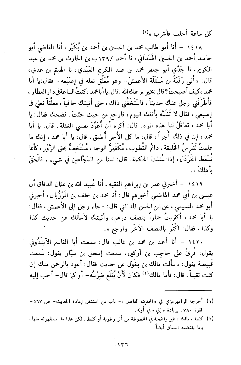 1418 - أنا أَبُو طَالِبٍ مُحَمَّدُ بْنُ الْحُسَيْنِ بْنِ أَحْمَدَ بْنِ بُكَيْرٍ أنا الْقَاضِي أَبُو حَامِدٍ أَحْمَدُ بْنُ الْحُسَيْنِ الْهَمَذَانِيُّ نا أَحْمَدُ بْنُ الْحَارِثِ بْنِ مُحَمَّدِ بْنِ عَبْدِ الْكَرِيمِ، نا جَدِّي أَبُو جَعْفَرٍ مُحَمَّدُ بْنُ عَبْدِ الْكَرِيمِ الْعَبْدِيُّ نا الْهَيْثَمُ بْنُ عَدِيٍّ، قَالَ: §" أَتَى رَقَبَةُ بْنُ مَسْقَلَةَ الْأَعْمَشُ وَهُوَ مُعَلِّقٌ نَعْلَهُ فِي إِصْبَعِهِ فَقَالَ: يَا أَبَا مُحَمَّدٍ كَيْفَ أَصْبَحْتَ؟ قَالَ: بِخَيْرٍ رَحِمَكَ اللَّهُ قَالَ: يَا أَبَا مُحَمَّدٍ كُنْتُ السَّاعَةَ فِي دَارِ الْعَطَّارِ فَأَطْرَفَنِي رَجُلٌ عَنْكَ حَدِيثًا فَاسْتَخْفَنِي ذَاكَ حَتَّى أَتَيْتُكَ حَافِيًا مُعَلِّقًا نَعْلِي فِي إِصْبَعِي فَقَالَ: لَا تَشَمَّهُ بِأَنْفِكَ الْيَوْمَ فَارْجِعْ مِنْ حَيْثُ جِئْتَ فَضَحِكَ فَقَالَ: يَا أَبَا مُحَمَّدٍ تَغَافَلْ لَنَا هَذِهِ الْمَرَّةَ قَالَ: أَكْرَهُ أَنْ أُعَوِّدَ نَفْسِي الْغَفْلَةَ قَالَ: يَا أَبَا مُحَمَّدٍ إِنَّ فِي ذَلِكَ أَجْرًا قَالَ: مَا كُلُّ الْأَجْرِ أُطِيقُ قَالَ: يَا أَبَا مُحَمَّدٍ إِنَّكَ مَا عَلِمْتُ لَشَرِسُ الْخَلِيقَةِ دَائِمُ الْقُطُوبِ مُكْفَهِرُّ الْوَجْهِ مُسْتَخِفٌ بِحَقِّ الزُّورِ كَأَنَّمَا تَسْعِطُ الْخَرْدَلَ إِذَا سُئِلْتَ الْحِكْمَةَ قَالَ: «لَسْنَا مِنَ السَّجَّاعِينَ فِي شَيْءٍ فَالْحَقْ بِأَهْلِكِ»