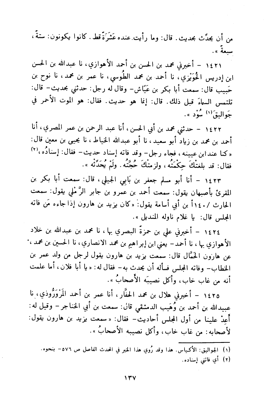 1425 - أَخْبَرَنِي هِلَالُ بْنُ مُحَمَّدٍ الْحَفَّارُ، أنا عُمَرُ بْنُ أَحْمَدَ الْمَرْوَرُّوذِيُّ، نا عُبَيْدُ اللَّهِ بْنُ أَحْمَدَ بْنِ وُهَيْبٍ الدِّمَشْقِيُّ، قَالَ: سَمِعْتُ ابْنَ أَبِي الْخَنَاجرِ، وَقِيلَ لَهُ: أَعِدْ عَلَيْنَا مِنْ أَوَّلِ الْمَجْلِسِ أَحَادِيثَ فَقَالَ: سَمِعْتُ يَزِيدَ بْنَ هَارُونَ يَقُولُ لِأَصْحَابِهِ: §«مَنْ غَابَ خَابَ وَأَكَلَ نَصِيبَهُ الْأَصْحَابُ» وَقَدْ كَانَ خَلْقٌ مِنْ طَلِبَةِ الْعِلْمِ بِالْبَصْرَةِ فِي زَمَنِ عَلِيِّ بْنِ الْمَدِينِيِّ يَأْخُذُونَ مَوَاضِعَهُمْ فِي مَجْلِسِهِ فِي لَيْلَةِ الْإِمْلَاءِ وَيَبِيتُونَ هُنَاكَ حِرْصًا عَلَى السَّمَاعِ وَتَخَوُّفَا مِنَ الْفَوَاتِ