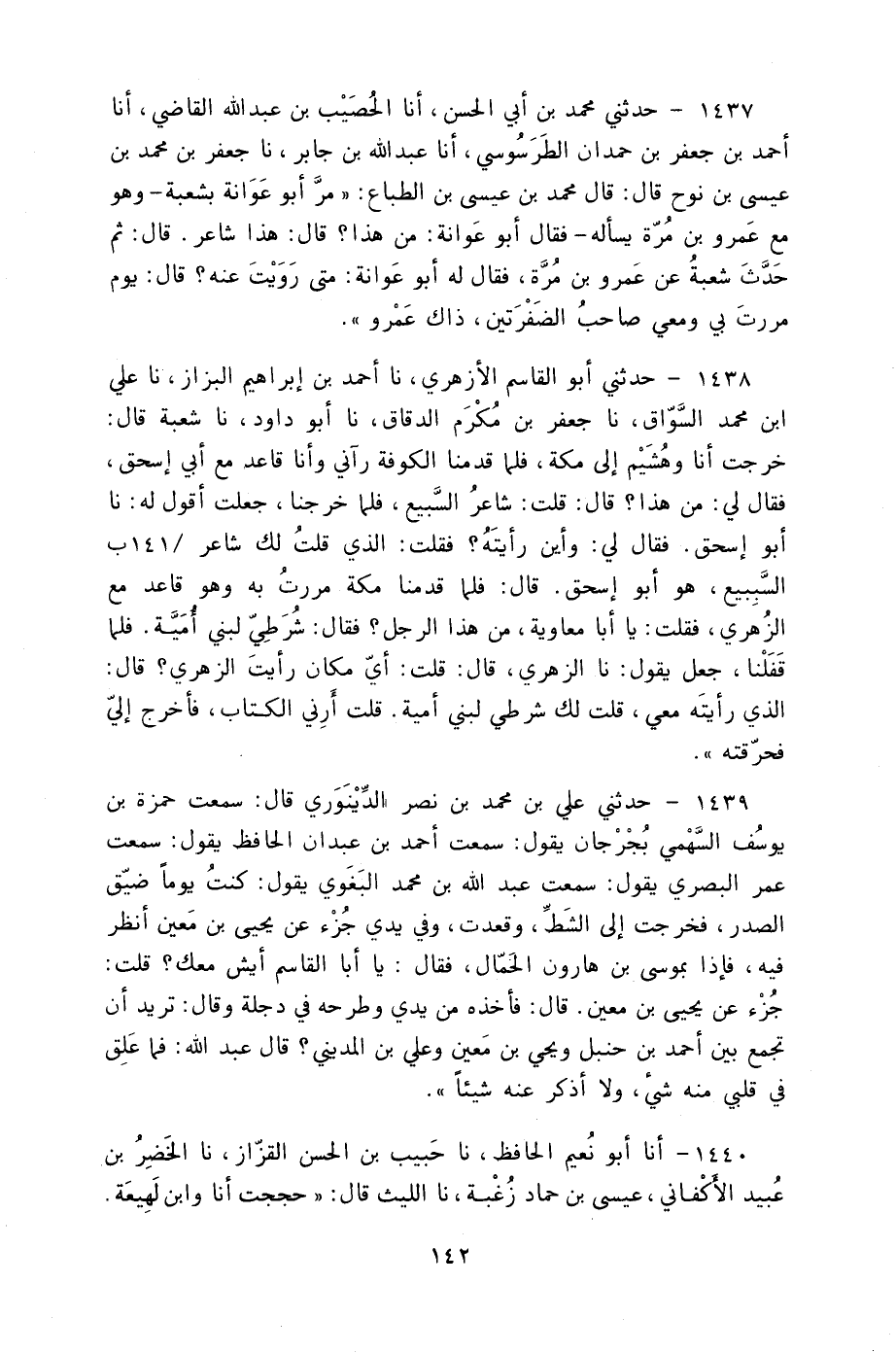 1437 - حَدَّثَنِي مُحَمَّدُ بْنُ أَبِي الْحَسَنِ، أنا الْحُصَيْبُ بْنُ عَبْدِ اللَّهِ الْقَاضِي، أنا أَحْمَدُ بْنُ جَعْفَرِ بْنِ حَمْدَانَ الطَّرَسُوسِيُّ، أنا عَبْدُ اللَّهِ بْنُ جَابِرٍ، نا جَعْفَرُ بْنُ مُحَمَّدِ بْنِ عِيسَى بْنِ نُوحٍ، قَالَ: قَالَ مُحَمَّدُ بْنُ عِيسَى بْنِ الطَّبَّاعِ: §" مَرَّ أَبُو عَوَانَةَ بِشُعْبَةَ وَهُوَ مَعَ عَمْرِو بْنِ مُرَّةَ يَسْأَلُهُ فَقَالَ أَبُو عَوَانَةَ: مَنْ هَذَا؟ قَالَ: هَذَا شَاعِرٌ قَالَ: ثُمَّ حَدَّثَ شُعْبَةُ عَنْ عَمْرِو بْنِ مُرَّةَ فَقَالَ لَهُ أَبُو عَوَانَةَ: مَتَى رَوَيْتَ عَنْهُ؟ قَالَ: يَوْمَ مَرَرْتَ بِي وَمَعِي صَاحِبُ الضَّفْرَتَيْنِ ذَاكَ عَمْرٌو "