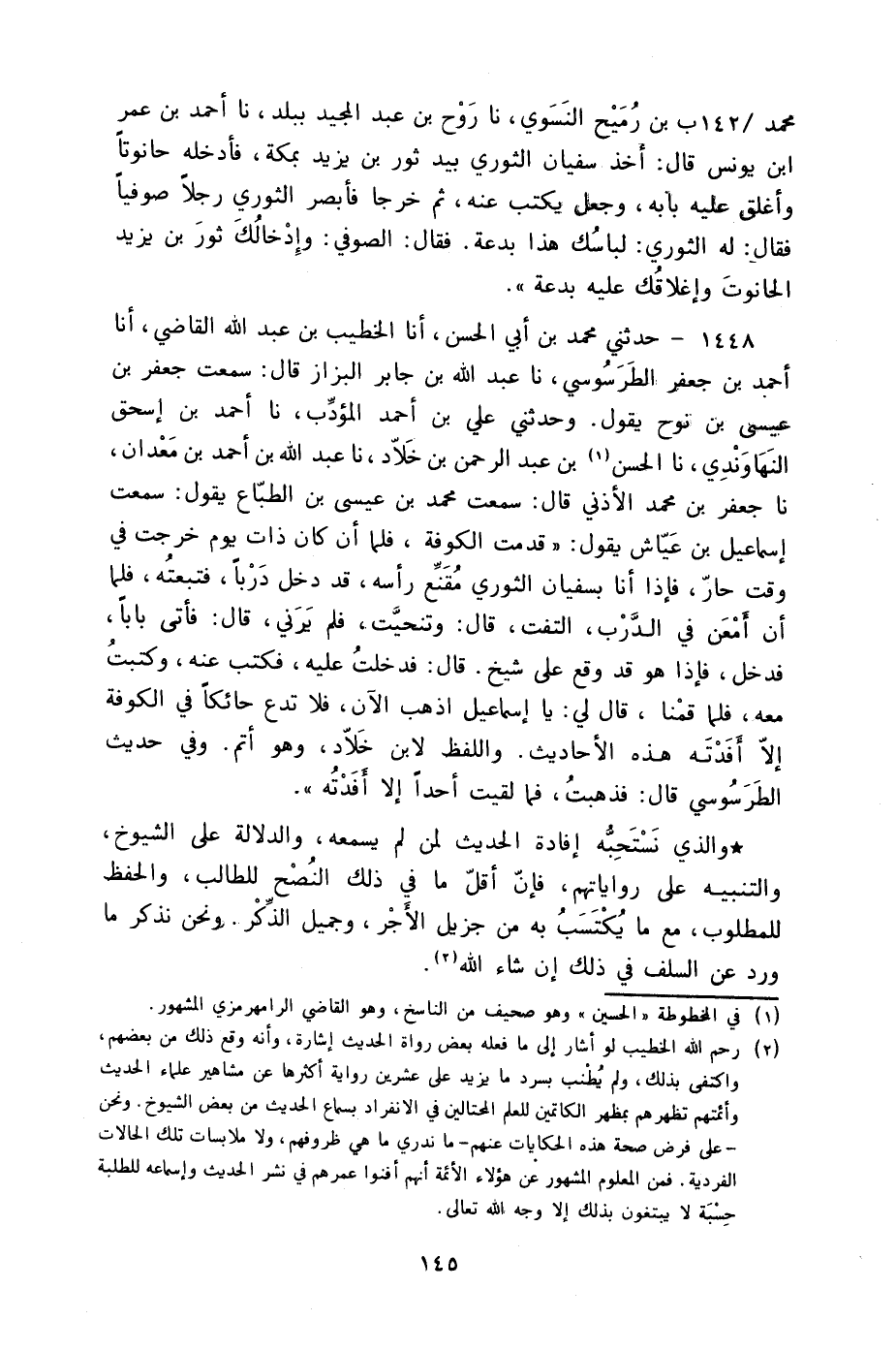 1448 - حَدَّثَنِي مُحَمَّدُ بْنُ أَبِي الْحَسَنِ، أنا الْخَطِيبُ بْنُ عَبْدِ اللَّهِ الْقَاضِي، أنا أَحْمَدُ بْنُ جَعْفَرٍ الطَّرَسُوسِيُّ، نا عَبْدُ اللَّهِ بْنُ جَابِرٍ الْبَزَّازُ، قَالَ: سَمِعْتُ جَعْفَرَ بْنَ عِيسَى بْنِ نُوحٍ، يَقُولُ: وَحَدَّثَنِي عَلِيُّ بْنُ أَحْمَدَ الْمُؤَدِّبُ، نا أَحْمَدُ بْنُ إِسْحَاقَ النَّهَاوَنْدِيُّ، نا الْحَسَنُ بْنُ عَبْدِ الرَّحْمَنِ بْنِ خَلَّادٍ، نا عَبْدُ اللَّهِ بْنُ أَحْمَدَ بْنِ مَعْدَانَ، نا جَعْفَرُ بْنُ مُحَمَّدٍ الْأُذُنِيُّ، قَالَ: سَمِعْتُ مُحَمَّدَ بْنَ عِيسَى بْنِ الطَّبَّاعِ، يَقُولُ: سَمِعْتُ إِسْمَاعِيلَ بْنَ عَيَّاشٍ، يَقُولُ: §" قَدِمْتُ الْكُوفَةَ فَلَمَّا أَنْ كَانَ ذَاتَ يَوْمٍ خَرَجْتُ فِي وَقْتٍ حَارٍّ فَإِذَا أَنَا بِسُفْيَانَ الثَّوْرِيِّ مُقَنِّعُ رَأْسَهُ قَدْ دَخَلَ دَرْبًا فَتَبِعْتُهُ فَلَمَّا أَنْ أَمْعَنَ فِي الدَّرْبِ الْتَفَتَ قَالَ: وَتَنَحَّيْتُ فَلَمْ يَرَنِي قَالَ: فَأَتَى بَابًا فَدَخَلَ فَإِذَا هُوَ قَدْ وَقَعَ عَلَى شَيْخٍ قَالَ: فَدَخَلْتُ عَلَيْهِ فَكَتَبَ عَنْهُ وَكَتَبْتُ مَعَهُ فَلَمَّا قُمْنَا قَالَ لِي: يَا إِسْمَاعِيلُ اذْهَبِ الْآنَ فَلَا تَدَعْ حَائِكًا فِي الْكُوفَةِ إِلَّا أَفَدْتَهُ هَذِهِ الْأَحَادِيثَ وَاللَّفْظُ لِابْنِ خَلَّادٍ وَهُوَ أَتَمُّ وَفِي حَدِيثِ الطَّرَسُوسِيُّ قَالَ: «فَذَهَبْتُ فَمَا لَقِيتُ أَحَدًا إِلَّا أَفَدْتُهُ» وَالَّذِي نَسْتَحِبُّهُ إِفَادَةَ الْحَدِيثِ لِمَنْ لَمْ يَسْمَعْهُ وَالدَّلَالَةَ عَلَى الشُّيُوخِ وَالتَّنْبِيهَ عَلَى رِوَايَاتِهِمْ فَإِنَّ أَقَلَّ مَا فِي ذَلِكَ النُّصْحُ لِلطَّالِبِ وَالْحِفْظُ لِلْمَطْلُوبِ مَعَ مَا يُكْتَسَبُ بِهِ مِنْ جَزِيلِ الْأَجْرِ وَجَمِيلِ الذِّكْرِ وَنَحْنُ نَذْكُرُ مَا وَرَدَ عَنِ السَّلَفِ فِي ذَلِكَ إِنْ شَاءَ اللَّهُ