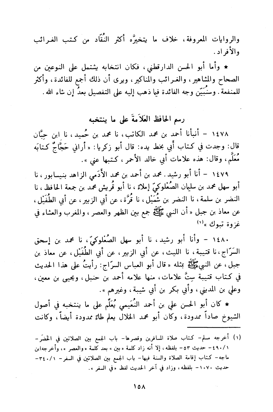 1480 - وأنا أَبُو رُشَيْدٍ، نا أَبُو سَهْلٍ الصُّعْلُوكِيُّ، نا مُحَمَّدُ بْنُ إِسْحَاقَ السَّرَّاجُ، نا قُتَيْبَةُ، نا اللَّيْثُ، عَنْ أَبِي الزُّبَيْرِ، عَنْ أَبِي الطُّفَيْلِ، عَنْ مُعَاذِ بْنِ جَبَلٍ، عَنِ النَّبِيِّ صَلَّى اللهُ عَلَيْهِ وَسَلَّمَ بِمِثْلِهِ قَالَ أَبُو الْعَبَّاسِ السَّرَّاجُ: " رَأَيْتُ عَلَى هَذَا الْحَدِيثِ فِي كِتَابِ قُتَيْبَةَ سِتَّ عَلَامَاتٍ مِنْهَا عَلَامَةُ أَحْمَدَ بْنِ حَنْبَلٍ وَيَحْيَى بْنِ مَعِينٍ وَعَلِيِّ بْنِ الْمَدِينِيِّ وَأَبِي بَكْرِ بْنِ أَبِي شَيْبَةَ وَغَيْرِهِمْ كَانَ أَبُو الْحَسَنِ عَلِيُّ بْنُ أَحْمَدَ النَّعِيمِيُّ يُعَلِّمُ عَلَى مَا يَنْتَخِبُهُ فِي أُصُولِ الشُّيُوخِ صَادًا مَمْدُودَةً وَكَانَ أَبُو مُحَمَّدٍ الْخَلَّالُ يُعَلِّمُ طَاءً مَمْدُودَةً أَيْضًا وَكَانَتْ -[159]- عَلَامَةُ مُحَمَّدِ بْنِ طَلْحَةَ النِّعَالِيِّ حَاءَيْنِ إِحْدَاهُمَا إِلَى جُنْبِ الْأُخْرَى، وَكَانَتْ عَلَامَةُ أَبِي الْفَضْلِ عَلِيِّ بْنِ الْحُسَيْنِ بْنِ الْفَلَكِيِّ الْهَمَذَانِيِّ نَزِيلِ نَيْسَابُورَ صُورَةَ هَمْزَتَيْنِ وَكُلُّهُمْ كَانَ يُعَلِّمُ فِي الْحَاشِيَةِ الْيُمْنَى مِنَ الْوَرَقَةَ بِحِبْرٍ وَرَأَيْتُ عَلَامَةَ أَبِي الْحَسَنِ الدَّارَقُطْنِيِّ فِي أَصْلٍ لِبَعْضِ الشُّيُوخِ فِي الْحَاشِيَةِ الْيُسْرَى خَطًّا عَرِيضًا بِالْحُمْرَةِ وَكَذَلِكَ كَانَ هِبَةُ اللَّهِ بْنُ الْحَسَنِ الطَّبَرِيُّ يُعَلِّمُ بِالْحُمْرَةِ إِلَّا أَنَّهَا كَانَتْ خَطًّا صَغِيرًا عَلَى أَوَّلِ إِسْنَادِ الْحَدِيثِ