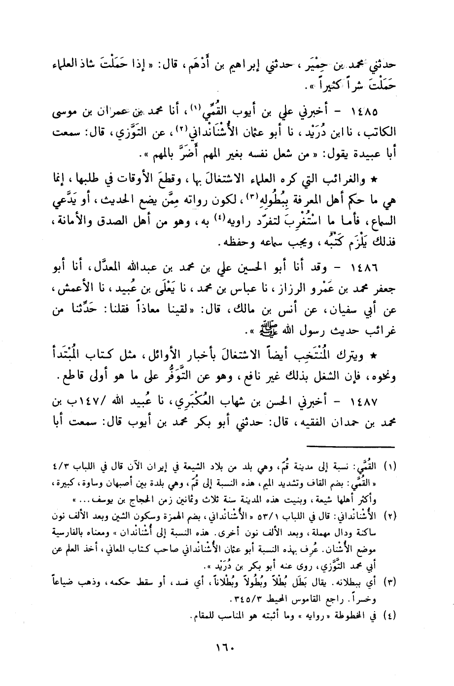 1485 - أَخْبَرَنِي عَلِيُّ بْنُ أَيُّوبَ الْقُمِّيُّ، أنا مُحَمَّدُ بْنُ عِمْرَانَ بْنِ مُوسَى الْكَاتِبُ، نا ابْنُ دُرَيْدٍ، نا أَبُو عُثْمَانَ الْأُشْنَانْدَانِيُّ، عَنِ التُّوزِيُّ، قَالَ: سَمِعْتُ أَبَا عُبَيْدَةَ، يَقُولُ: §«مَنْ شَعَلَ نَفْسَهُ بِغَيْرِ الْمُهِمِّ أَضَرَّ بِالْمُهِمِّ» وَالْغَرَائِبُ الَّتِي كَرِهَ الْعُلَمَاءُ الِاشْتِغَالَ بِهَا وَقَطْعَ الْأَوْقَاتِ فِي طَلَبِهَا إِنَّمَا هِيَ مَا حَكَمَ أَهْلُ الْمَعْرِفَةِ بِبُطُولِهِ لِكَوْنِ رِوَاتُهُ مِمَّنْ يَضَعُ الْحَدِيثَ أَوْ يَدَّعِي السَّمَاعَ فَأَمَّا مَا اسْتُغْرِبَ لِتَفَرُّدِ رَاوِيهِ بِهِ وَهُوَ مِنْ أَهْلِ الصِّدْقِ وَالْأَمَانَةِ فَذَلِكَ يَلْزَمُ كَتْبُهُ وَيَجِبُ سَمَاعُهُ وَحَفِظُهُ