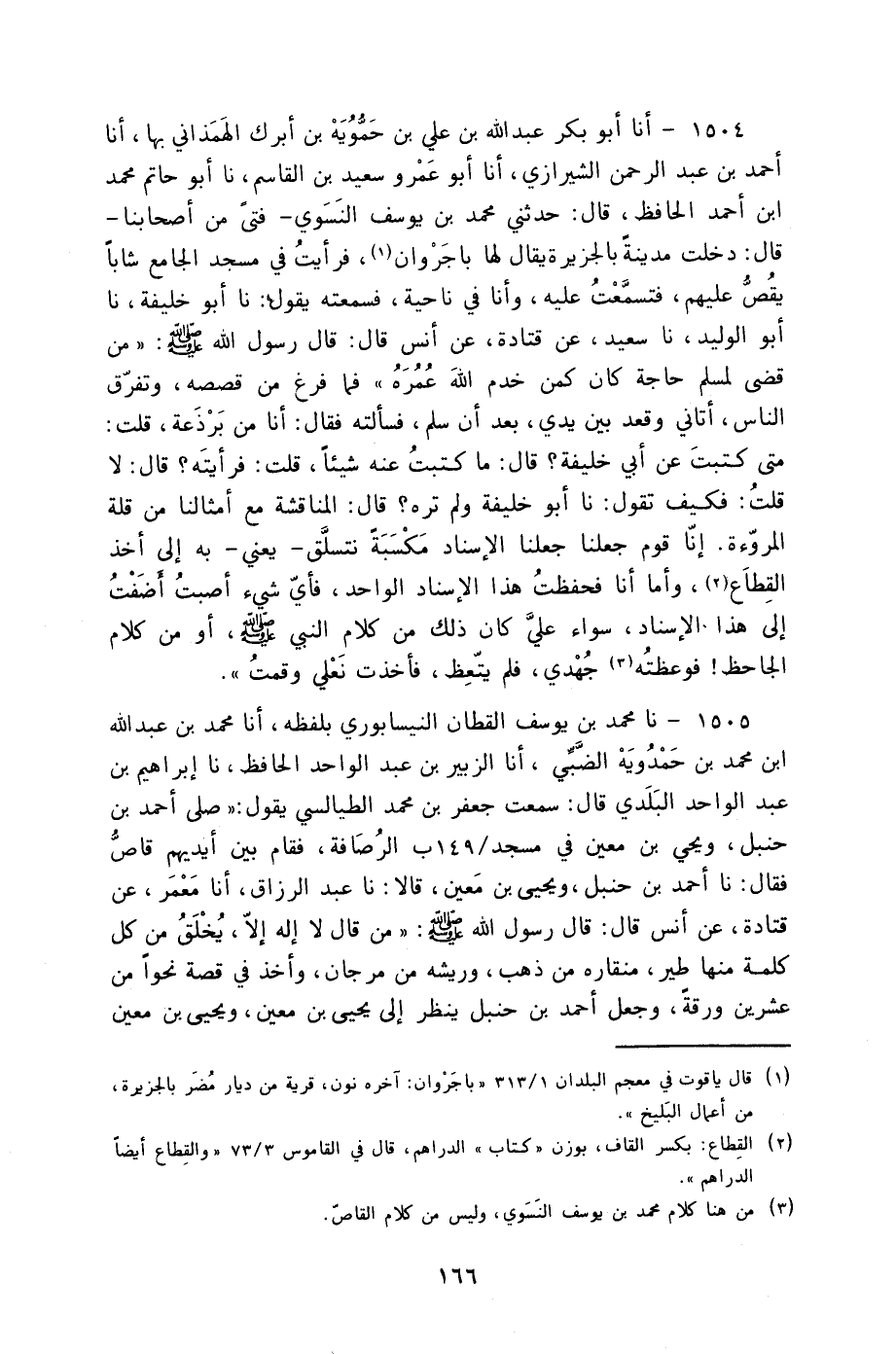 1504 - أنا أَبُو بَكْرٍ عَبْدُ اللَّهِ بْنُ عَلِيِّ بْنِ حَمُّوَيَهِ بْنِ أَبْرَكَ الْهَمَذَانِيُّ، بِهَا، أنا أَحْمَدَ بْنَ عَبْدِ الرَّحْمَنِ الشِّيرَازِيَّ، أنا أَبُو عَمْرٍو سَعِيدُ بْنُ الْقَاسِمِ نا أَبُو حَاتِمٍ مُحَمَّدُ بْنُ أَحْمَدَ الْحَافِظُ قَالَ: حَدَّثَنِي مُحَمَّدُ بْنُ يُوسُفَ النَّسَوِيُّ، فَتًى مِنْ أَصْحَابِنَا قَالَ: " §دَخَلْتُ مَدِينَةً بِالْجَزِيرَةِ يُقَالُ لَهَا: بِاجَرْوَانُ فَرَأَيْتُ فِيَ مَسْجِدِ الْجَامِعِ شَابًّا يَقُصُّ عَلَيْهِمْ فَتَسَمَّعْتُ عَلَيْهِ وَأَنَا فِي نَاحِيَةٍ فَسَمِعْتُهُ يَقُولُ: " نَا أَبُو خَلِيفَةَ نَا أَبُو الْوَلِيدِ نَا سَعِيدٌ عَنْ قَتَادَةَ عَنْ أَنَسٍ قَالَ: قَالَ رَسُولُ اللَّهِ صَلَّى اللهُ عَلَيْهِ وَسَلَّمَ: «مَنْ قَضَى لِمُسْلِمٍ حَاجَةً كَانَ كَمَنْ خَدَمَ اللَّهَ عُمْرَهُ» . فَمَا فَرَغَ مِنْ قَصَصِهِ وَتَفَرَّقَ النَّاسُ أَتَانِي وَقَعَدَ بَيْنَ يَدَيَّ بَعْدَ أَنْ سَلَّمَ فَسَأَلْتُهُ فَقَالَ: أَنَا مِنْ بَرْذَعَةَ قُلْتُ: مَتَى كَتَبْتَ عَنْ أَبِي خَلِيفَةَ؟ قَالَ: مَا كَتَبْتُ عَنْهُ شَيْئًا قُلْتُ: فَرَأَيْتَهُ؟ قَالَ: لَا قُلْتُ: فَكَيْفَ تَقُولُ: نَا أَبُو خَلِيفَةَ وَلَمْ تَرَهُ؟ قَالَ: الْمُنَاقَشَةُ مَعَ أَمْثَالِنَا مِنْ قِلَّةِ الْمُرُوءَةِ إِنَّا قَوْمٌ جَعَلْنَا جَعَلْنَا الْإِسْنَادَ مَكْسَبَةً نَتَسَلَّقُ يَعْنِي بِهِ إِلَى أَخْذِ الْقِطَاعِ وَأَمَّا أَنَا فَحَفِظْتُ هَذَا الْإِسْنَادَ الْوَاحِدَ فَأَيُّ شَيْءٍ أَصَبْتُ أَضَفْتُ إِلَى هَذَا الْإِسْنَادِ سَوَاءً عَلَيَّ كَانَ ذَلِكَ مِنْ كَلَامِ النَّبِيِّ صَلَّى اللهُ عَلَيْهِ وَسَلَّمَ أَوْ مِنْ كَلَامِ الْجَاحِظِ فَوَعَظْتُهُ جُهْدِي فَلَمْ يَتَّعِظْ فَأَخَذْتُ نَعْلِي وَقُمْتُ "