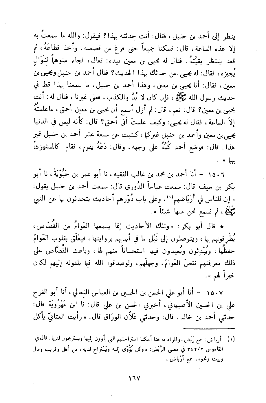 1506 - أنا أَحْمَدُ بْنُ مُحَمَّدِ بْنِ غَالِبٍ الْفَقِيهُ، نا أَبُو عُمَرَ بْنُ حَيُّوَيْهِ، نا أَبُو بَكْرِ بْنُ سَيْفٍ، قَالَ: سَمِعْتُ عَبَّاسًا الدُّورِيَّ، قَالَ: سَمِعْتُ أَحْمَدَ بْنَ حَنْبَلٍ، يَقُولُ: «إِنَّ §لِلنَّاسِ فِي أَرْبَاضِهِمْ وَعَلَى بَابِ دُورِهِمْ أَحَادِيثَ يَتَحَدَّثُونَ بِهَا عَنِ النَّبِيِّ صَلَّى اللهُ عَلَيْهِ وَسَلَّمَ لَمْ نَسْمَعْ نَحْنُ مِنْهَا شَيْئًا» قَالَ أَبُو بَكْرٍ: وَتِلْكَ الْأَحَادِيثُ إِنَّمَا يَسْمَعُهَا الْعَوَامُّ مِنَ الْقُصَّاصِ يُطْرِفُونَهُمْ بِهَا وَيَتَوَصَّلُونَ إِلَى نَيْلِ مَا فِي أَيْدِيهِمْ بِرِوَايَتِهَا فَيَعْلَقُ بِقُلُوبِ الْعَوَامِّ حَفِظُهَا وَيُبْدِئُونَ وَيُعِيدُونَ فِيهَا اسْتِحْسَانًا مِنْهُمْ لَهَا وَبَاعِثُ الْقُصَّاصِ عَلَى ذَلِكَ مَعْرِفَتُهُمْ نَقَصَ الْعَوَامِّ وَجَهْلِهِمْ وَلَوْ صَدَقُوا اللَّهَ فِيمَا يُلْقُونَهُ إِلَيْهِمْ لَكَانَ خَيْرًا لَهُمْ